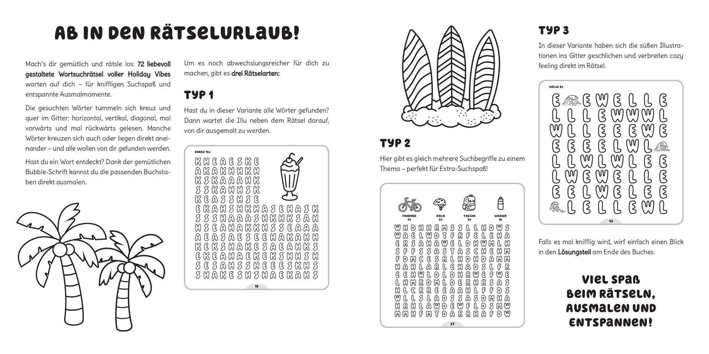 Wortsuchrätsel einmal anders! Bei Cozy Word Search Holiday Vibestrifft Urlaubs-Feeling 72x auf jede Menge Rätselspaß und herrlich entspannendes Ausmalen. Anhand der abgebildeten niedlichen Illustrationen rund um die schönste Zeit des Jahres, nämlich Urlaub, müssen die entsprechenden Begriffe im Wortgitter gefunden werden. Das Tolle daran: Alle Illustrationen und Buchstaben sind so gestaltet, dass sie sich wunderbar ausmalen lassen. So wird aus jedem gelösten Rätsel ganz nebenbei ein kleines Kunstwerk.