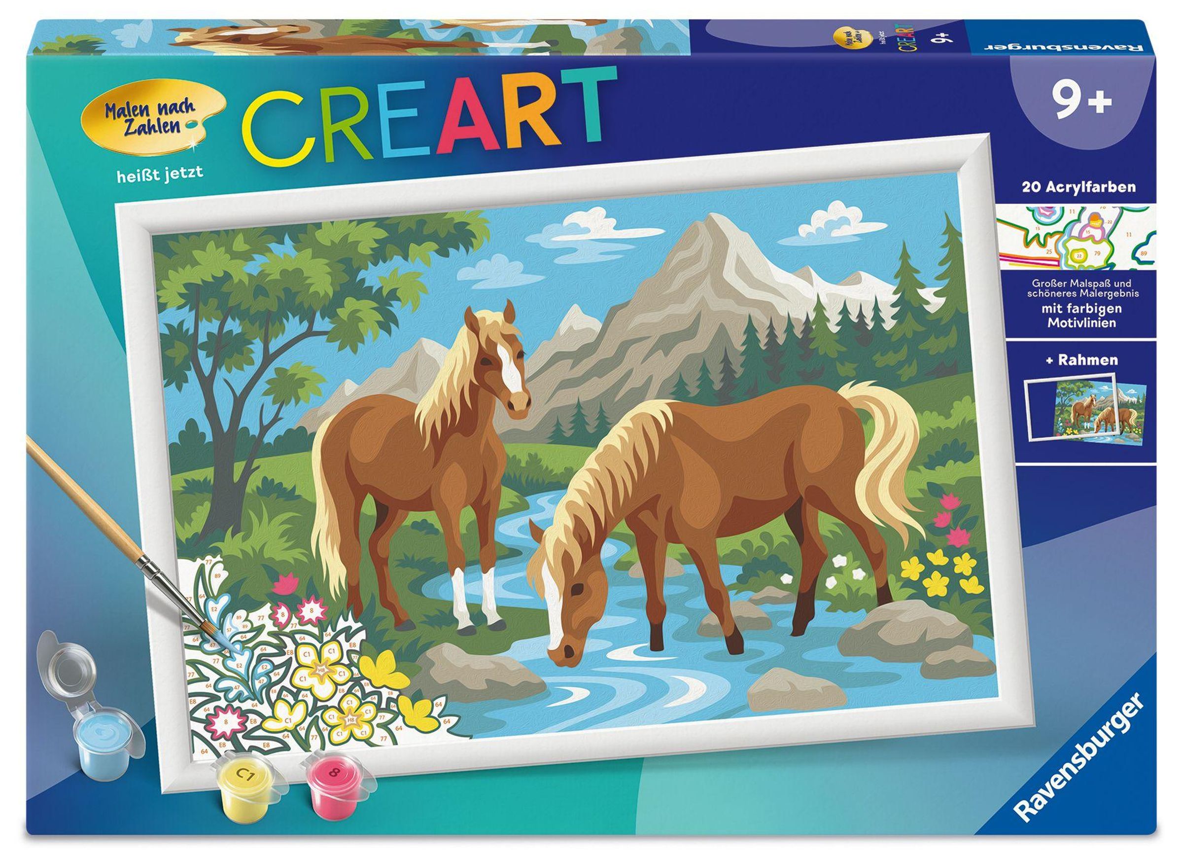 "Malen nach Zahlen", "CREART", "heißt jetzt", "9+", "20 Acrylfarben". Zwei Pferde an einem Bach, Berge im Hintergrund., Spiele
