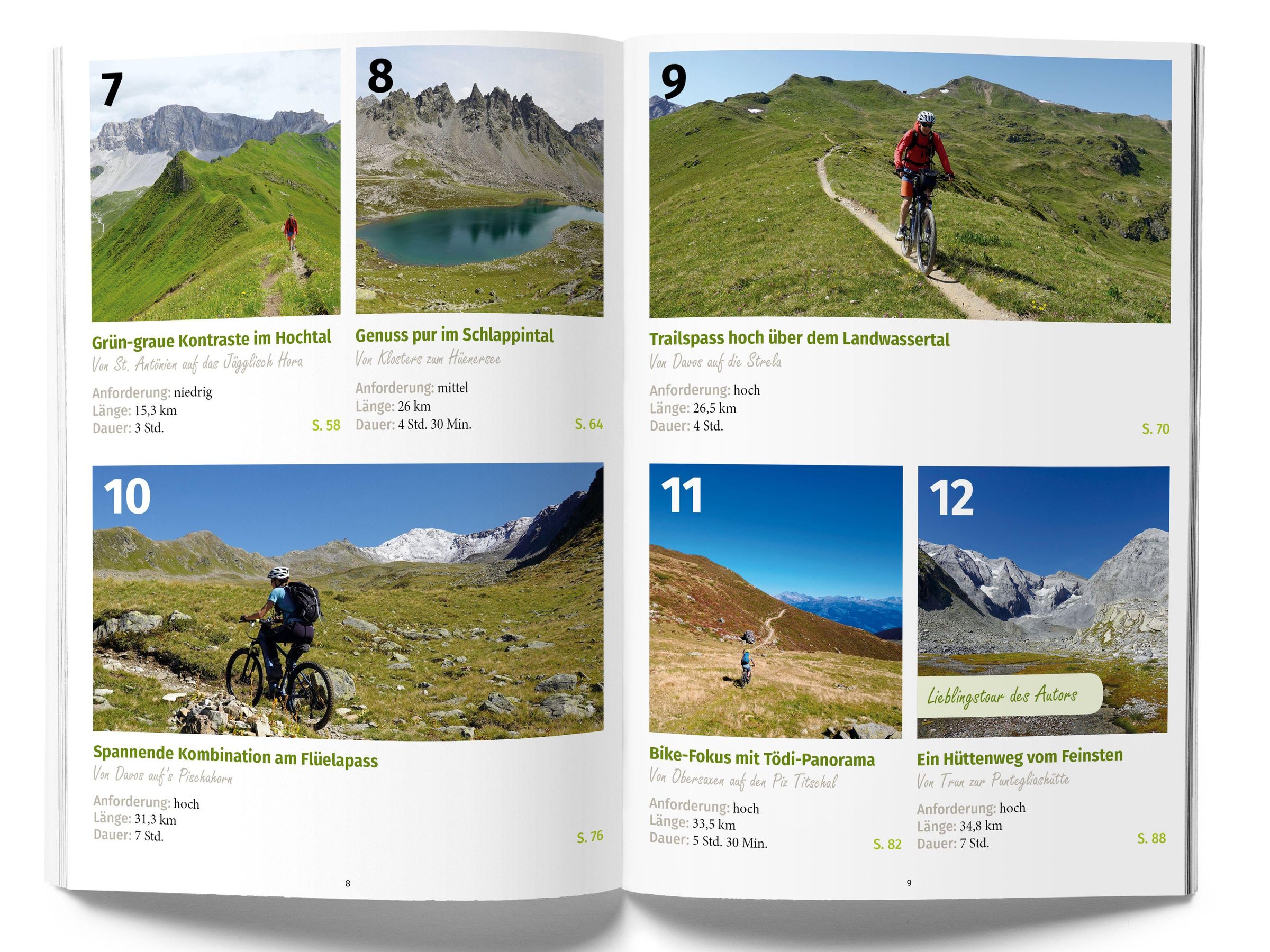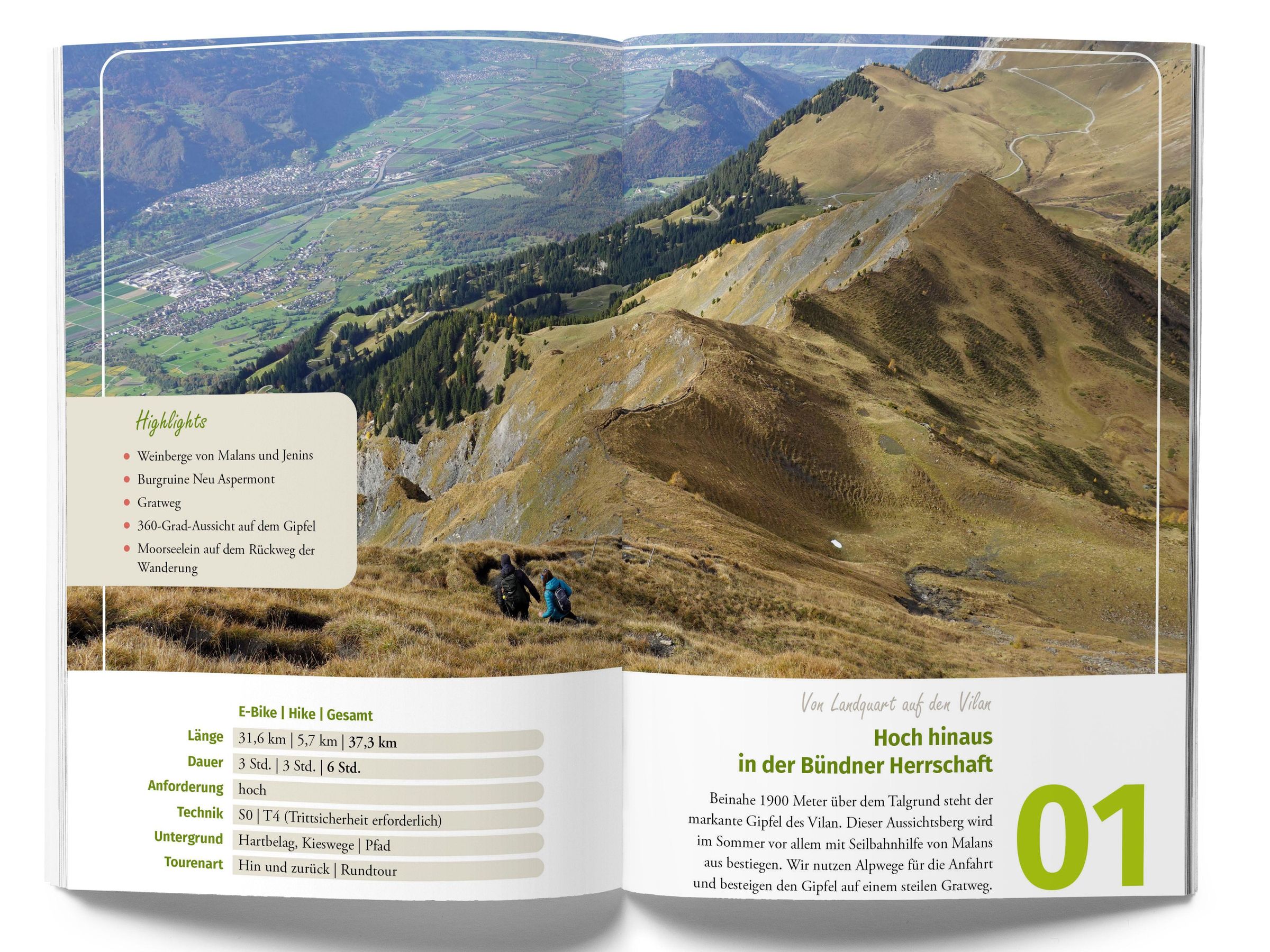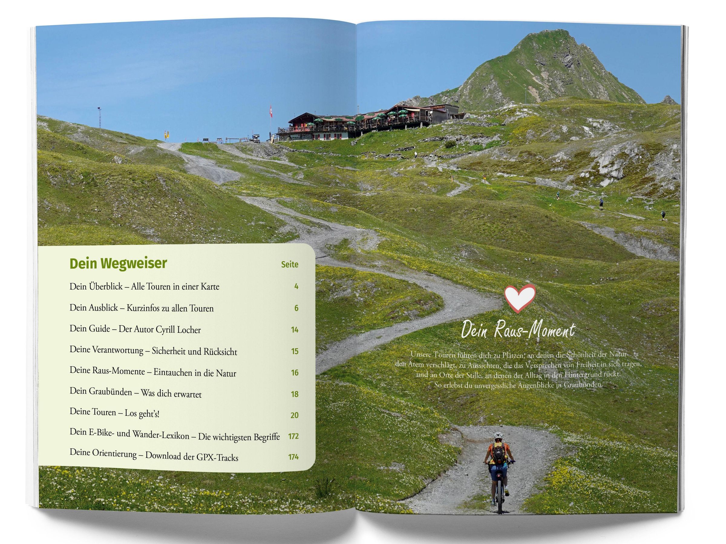 E-Bike- & Hike-Touren in Graubünden: Ganz ohne technische Voraussetzungen auf dem Bike erschliessen die Wandertouren mit An- und Abfahrten auf dem E-MTB komfortabel abgelegene Ziele und höhere Lagen. Entwickelt wurden sie vom Wanderguide und Bike-Reiseleiter Cyrill Locher. Im Mittelpunkt stehen Raus-Momente, die zu Entspannung und Entschleunigung führen, eine Verbindung zur Natur aufbauen und das Highlight einer jeden der abwechslungsreichen 25 Touren sind. Die detaillierten Wegbeschreibungen werden ergänzt von Höhenprofilen, Kartendetails, praktischen Infos wie Einkehr und Anfahrt sowie herunterladbaren GPS-Daten in Form von GPX-Tracks. Also nichts wie raus an die frische Luft!