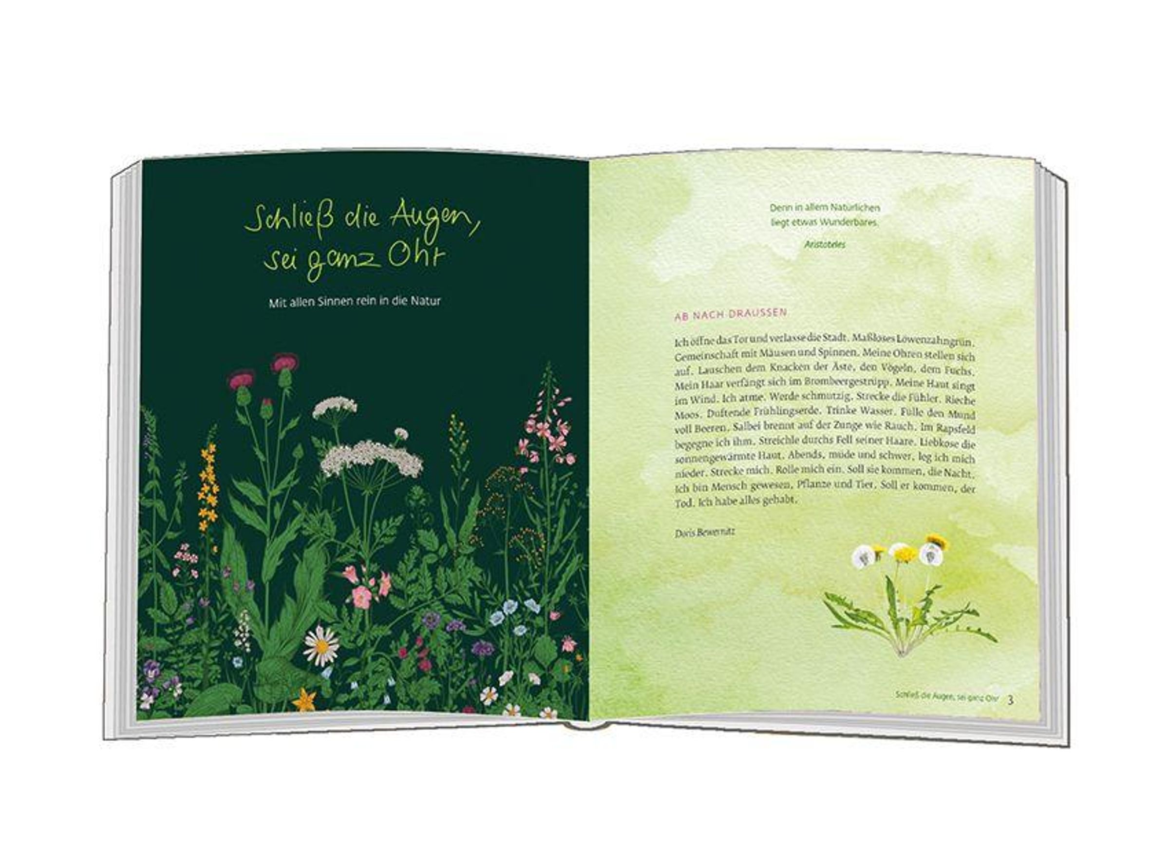 „Da blüht die Seele auf. Vom Glück, in der Natur zu sein.“ Bunte Blumen, Blätter und Pilze formen einen Schmetterling., Buch