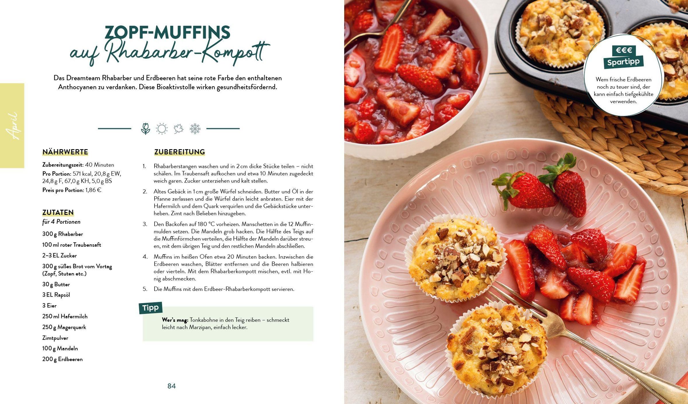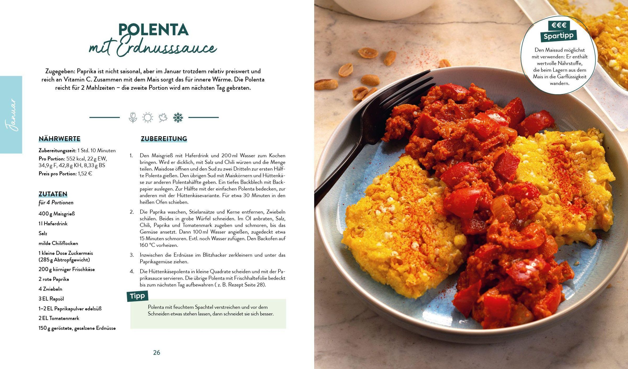 Welche Kräuter und Gewürze sich wodurch ersetzen lassen, zeigt eine Übersicht am Ende des Buches. Ein Saisonkalender zeigt außerdem, welche Obst- und Gemüsesorten wann besonders preiswert sind. Auberginen im Angebot? Großartig! Dann schnell im Register nach passenden Rezepten schauen und loslegen! Oder auch mal Lust auf Süßes? Unter den acht Rezeptideen jedes Monats findet sich immer auch eine Süße!