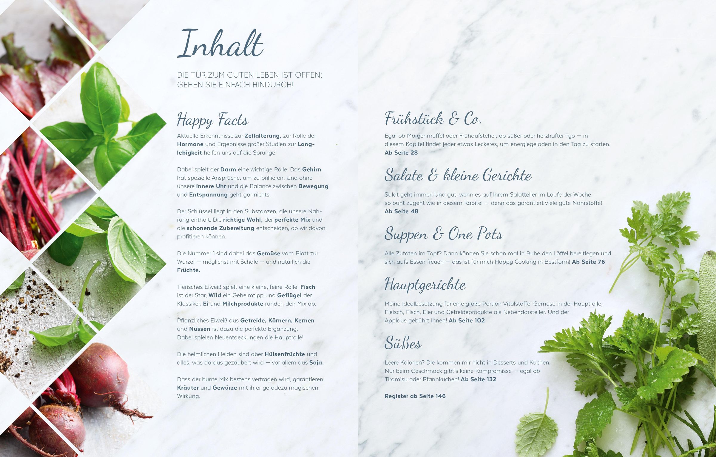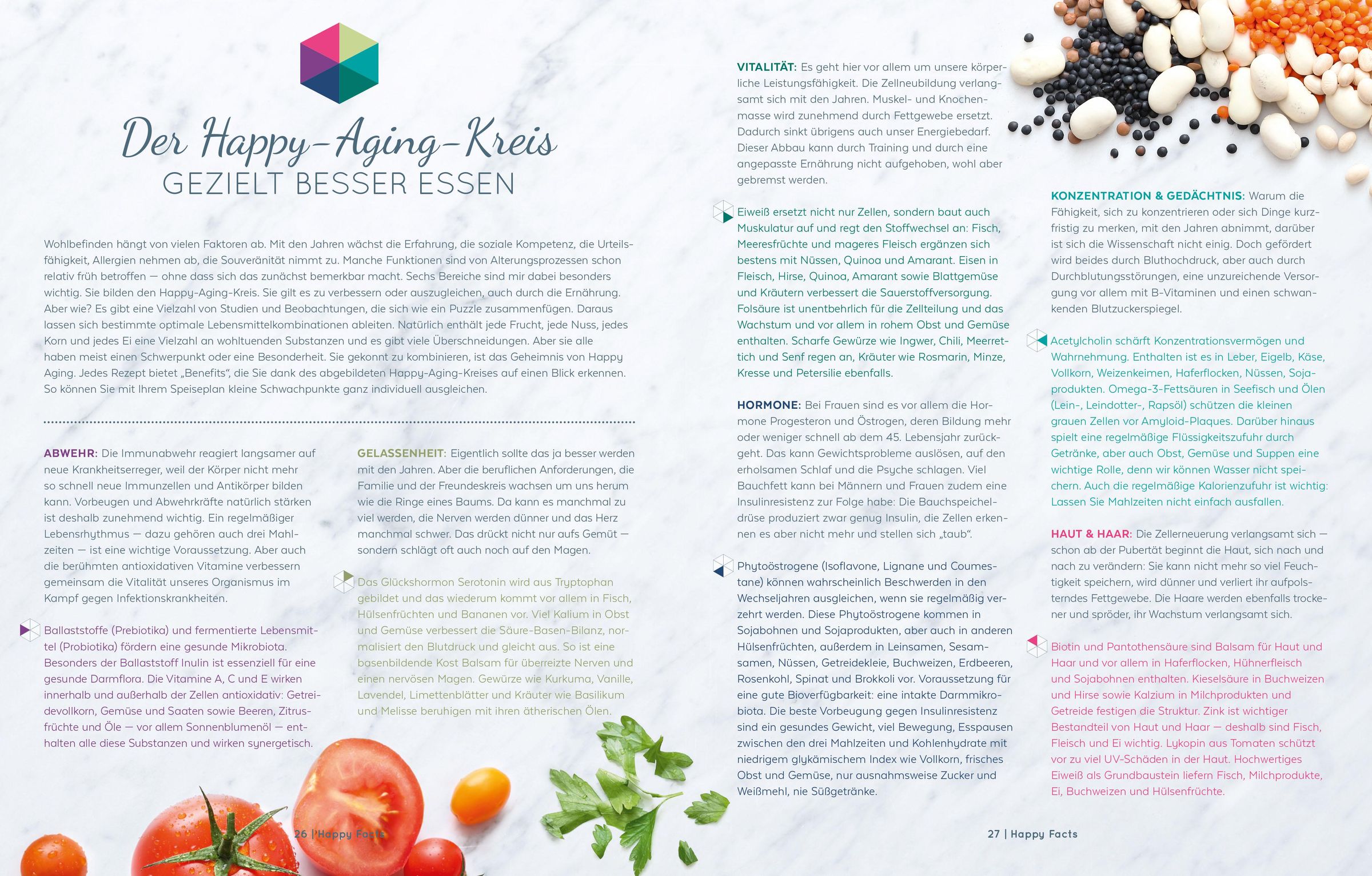 Anti-Aging war gestern - von nun an heißt es: Happy Aging! Die Kinder sind aus dem Haus, im Beruf läuft alles rund und den richtigen Sport hat man längst gefunden. Was kommt nun? Älterwerden? Wechseljahre? Lästige Falten und schlabberige Unterarme? Auf keinen Fall! Wirf deine alten Gewohnheiten über Bord und sieh das Älterwerden als Chance. Mit ihrem neuen Buch präsentiert Dagmar von Cramm Frauen eine große Auswahl an diversen Rezepten, mit denen sie sich ausgewogen und achtsam ernähren können. Daneben liefert die Ernährungswissenschaftlerin Informationen zu den Ursachen von Beschwerden wie Verdauungsträgheit, schlechter Schlaf oder schwaches Konzentrationsvermögen. Alle Rezepte sind mit einem Button gezeichnet, der über den Zusatznutzen der Gerichte informiert: Sei es "Für Haut & Haar", "Für mehr Vitalität", oder "Für Hormonbalance" - wobei der Genussaspekt natürlich ganz vorn steht. Ob eine Linsen-Currycreme, Mango-Tomaten-Hähnchen mit Nuss-Bulgur oder Fischfilet mit Süßkartoffelpüree: Koche, was dich happy macht!
