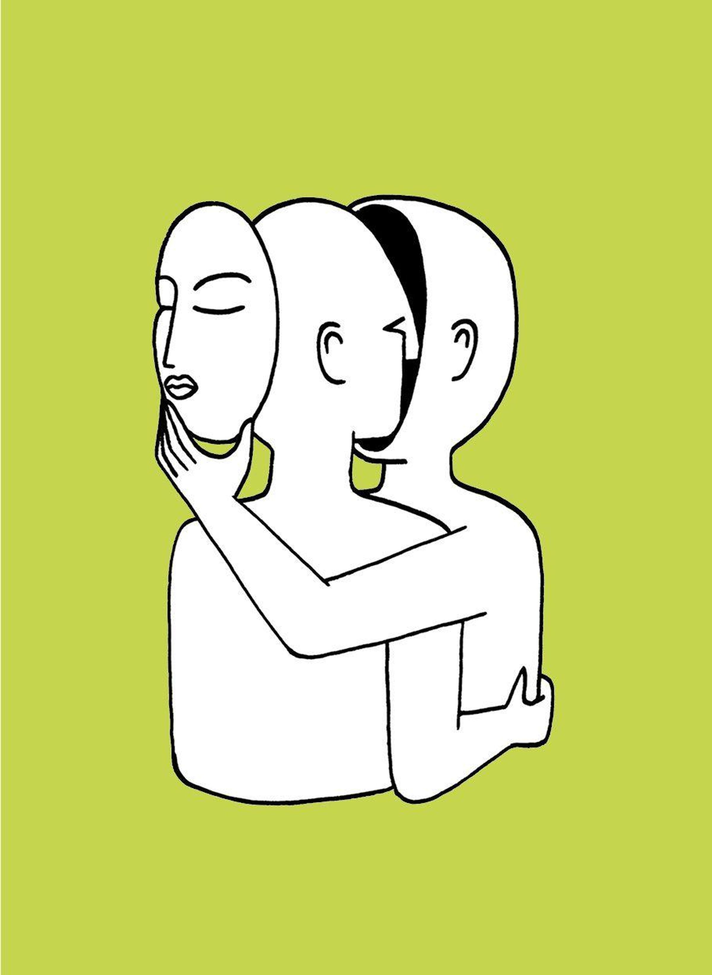 Zwei stilisierte Figuren umarmen sich, eine hält eine abnehmbare Maske, vor einem grünen Hintergrund., Kalender