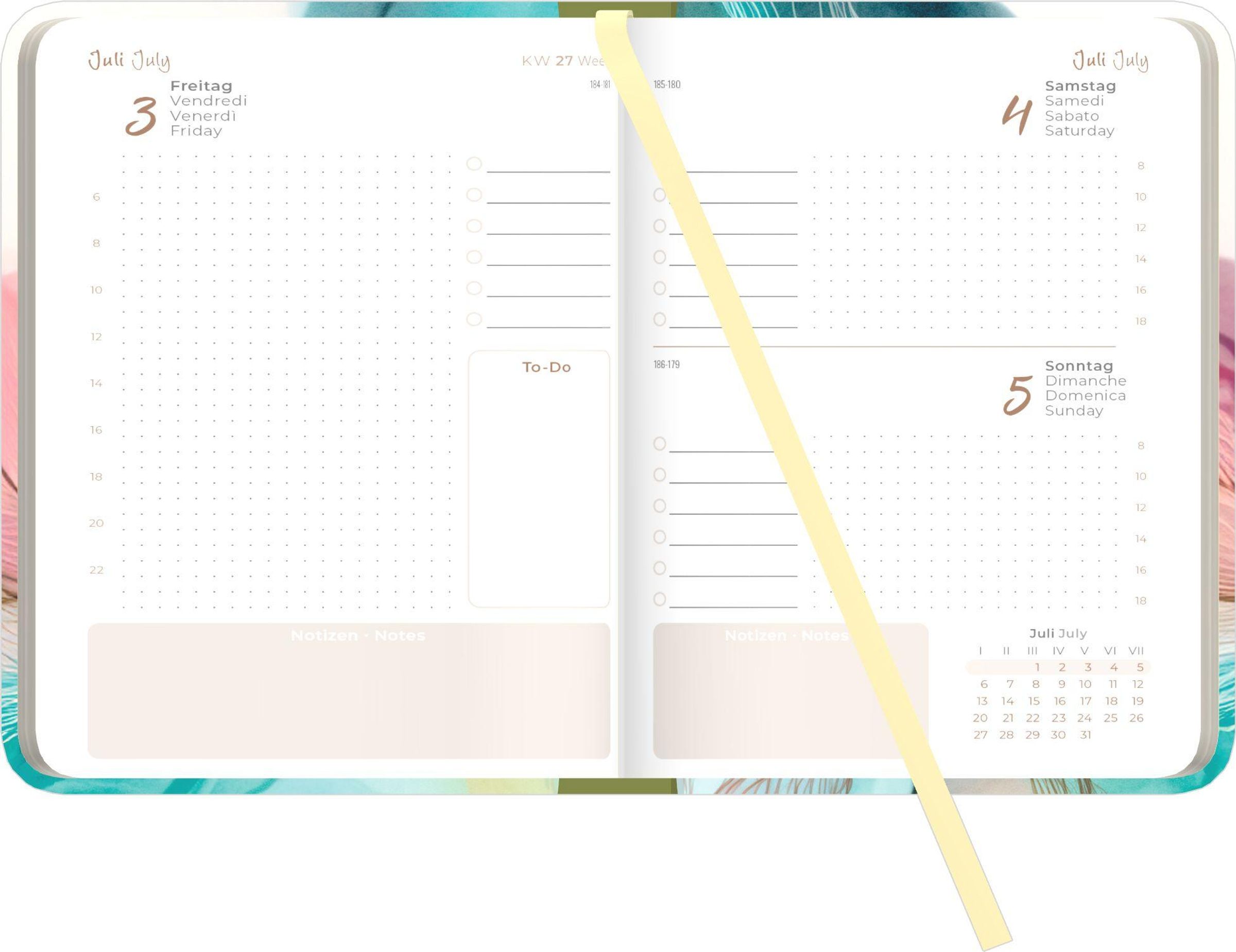 Umfassende Organisation: 352 Seiten mit 1 Tag pro Seite, Zeiteinteilung von 06--22 Uhr, To-Do-Liste und zusätzlichem Notizbereich