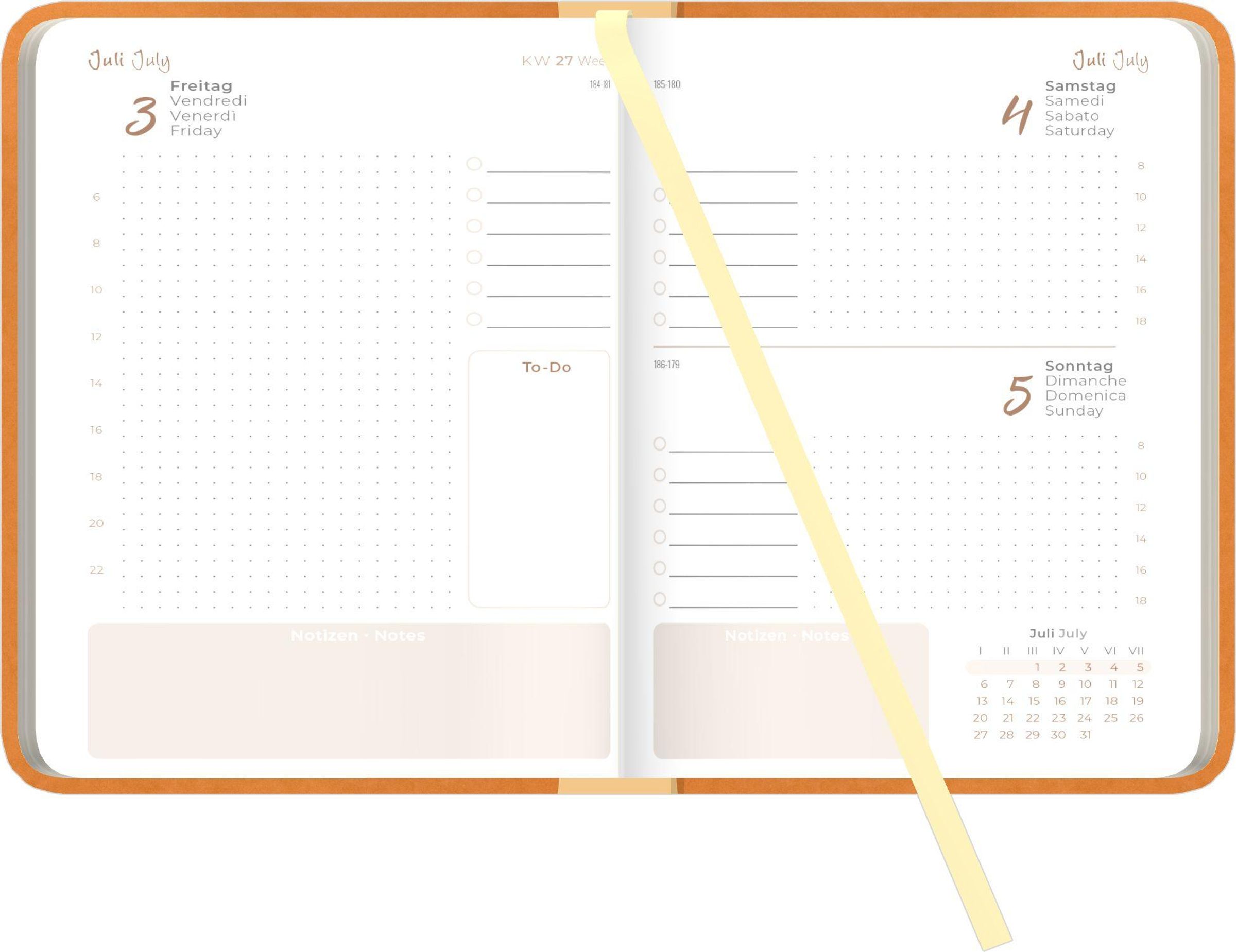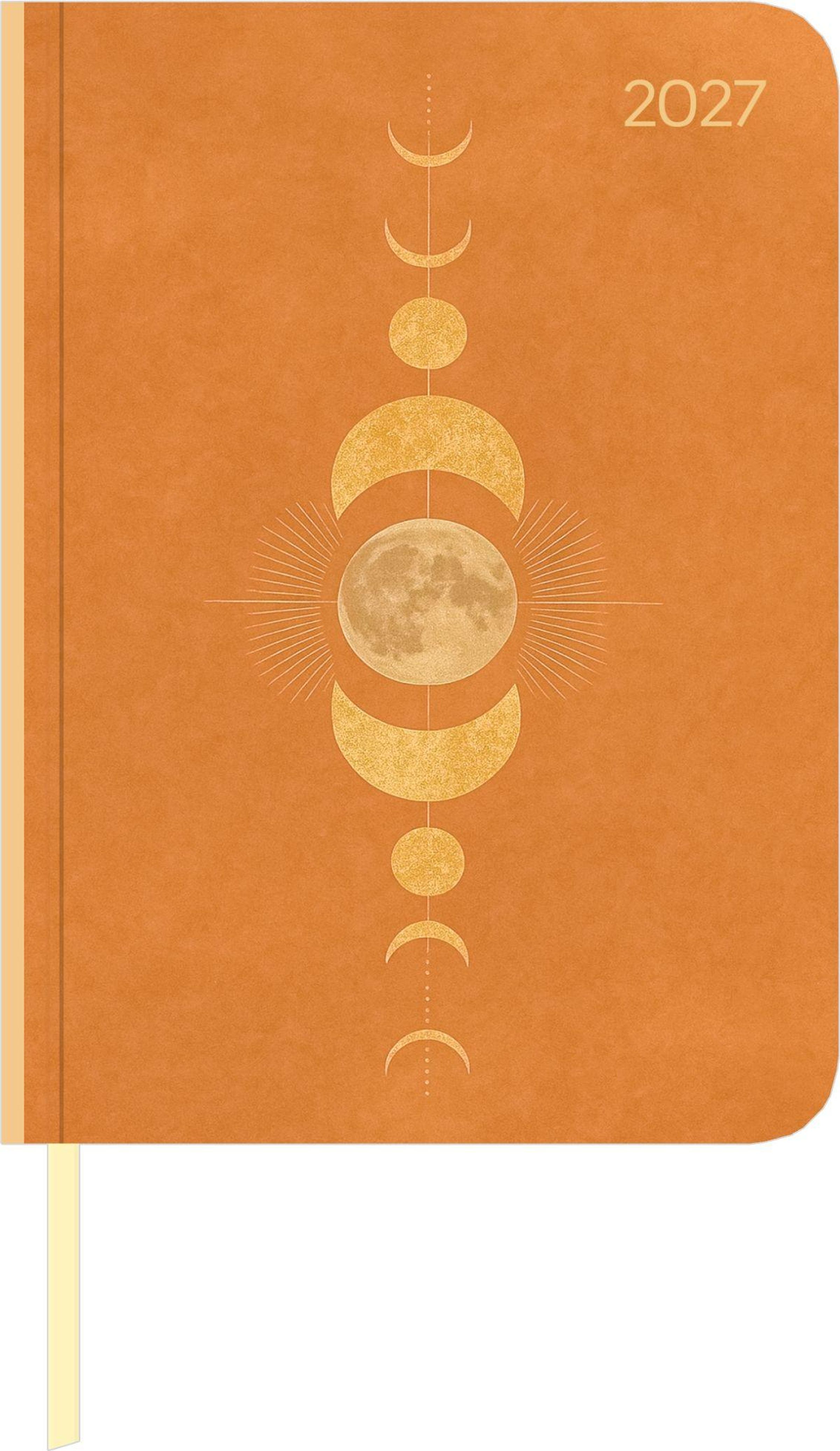 "2027" in der Ecke. Zentral eine Illustration von Mondphasen auf orangefarbenem Hintergrund., Kalender