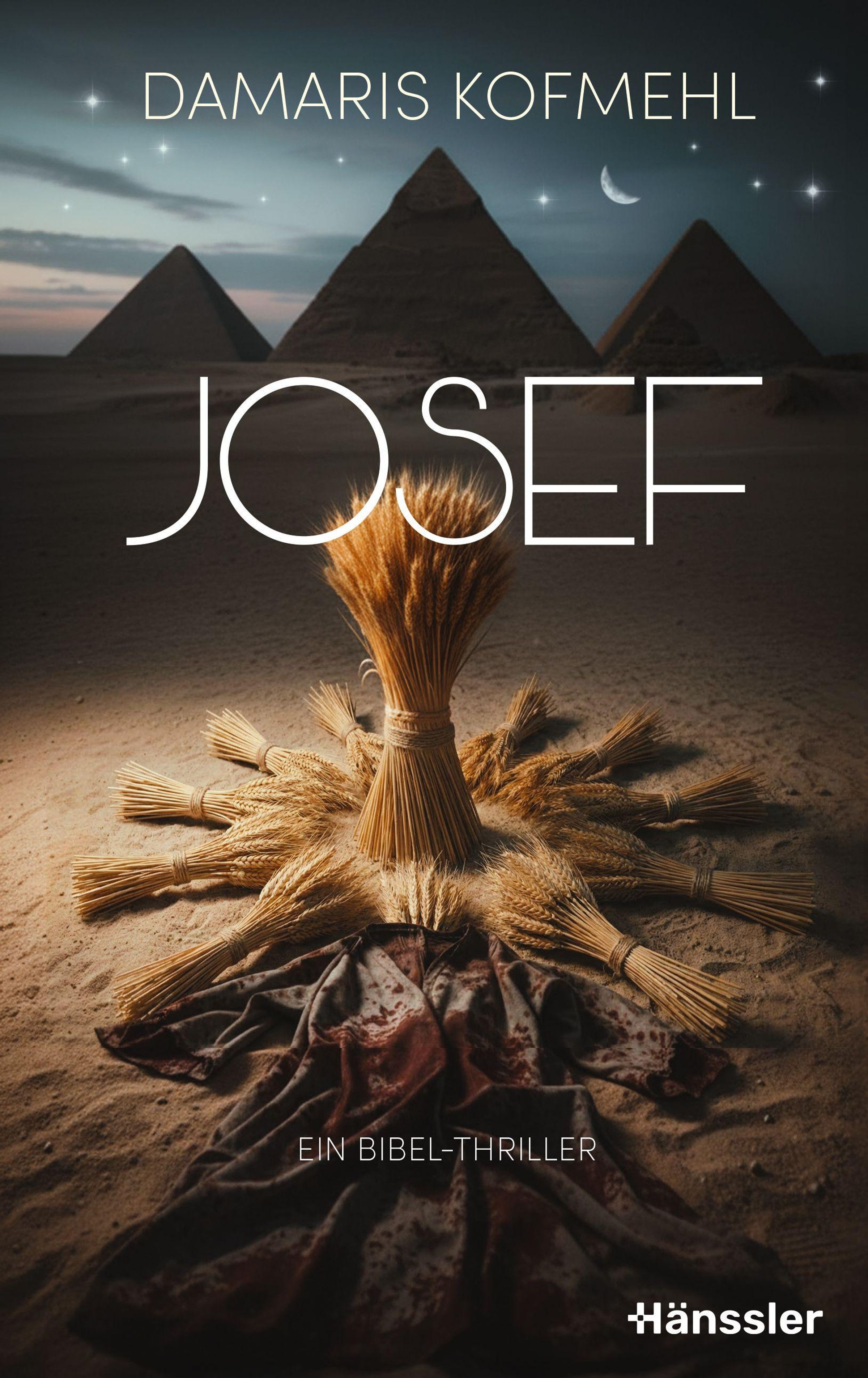 Oben steht "DAMARIS KOFMEHL", darunter "JOSEF". In der Mitte sind Pyramiden mit Nachthimmel. Strohgarben auf Sand., Buch