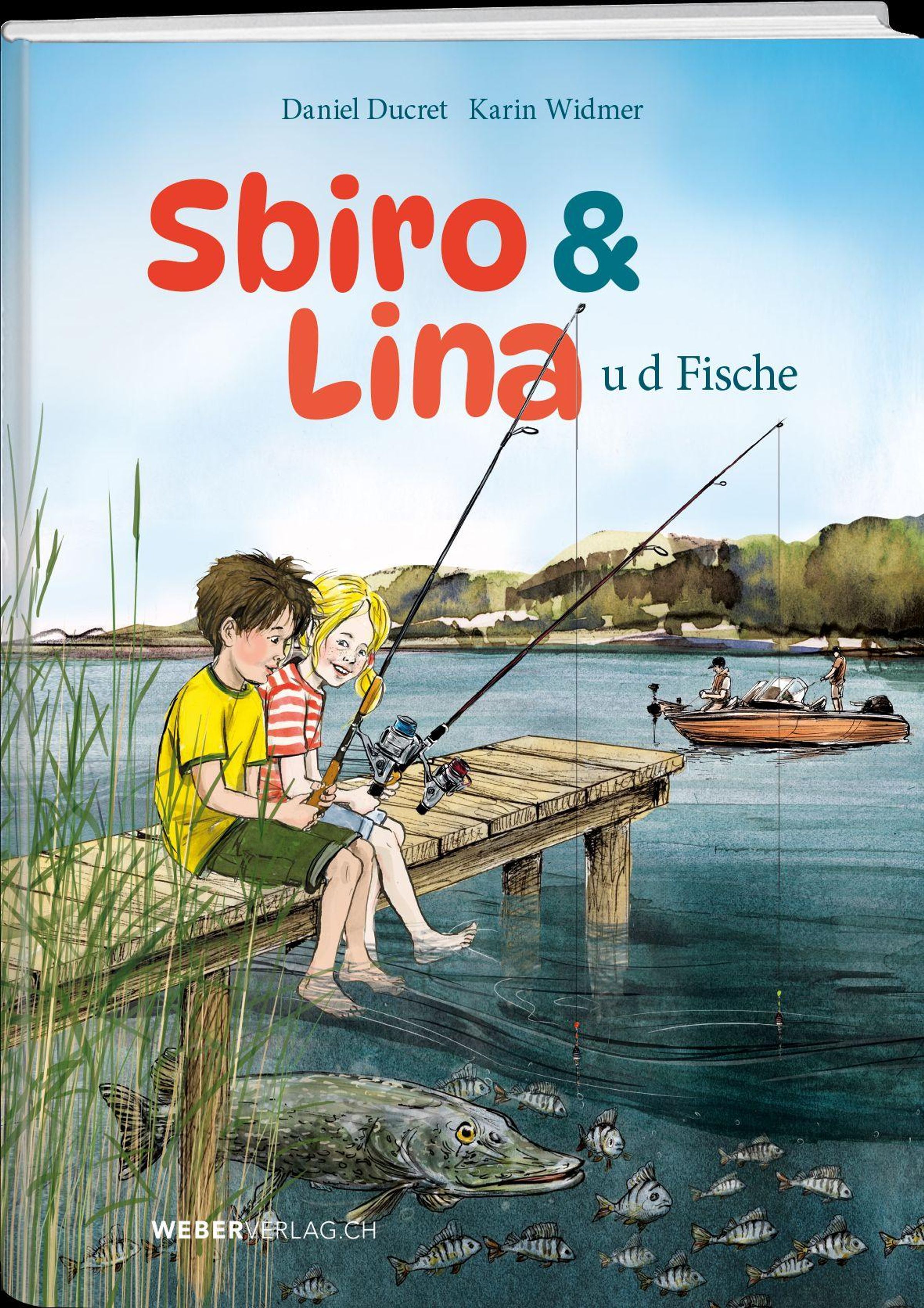 „Sbiro & Lina u d Fische“ von Daniel Ducret und Karin Widmer. Kinder angeln am Steg, Fische im Wasser sichtbar., Buch
