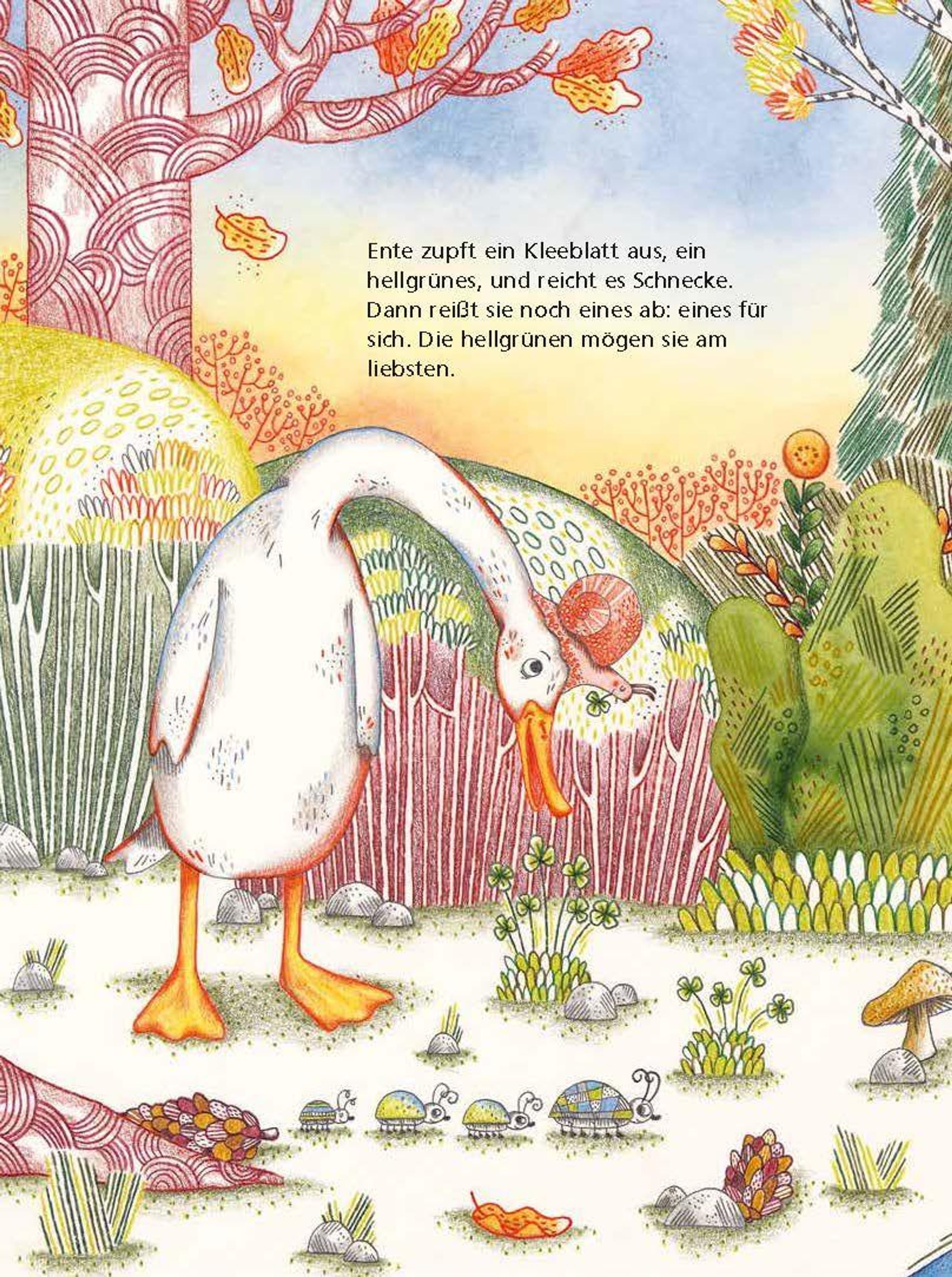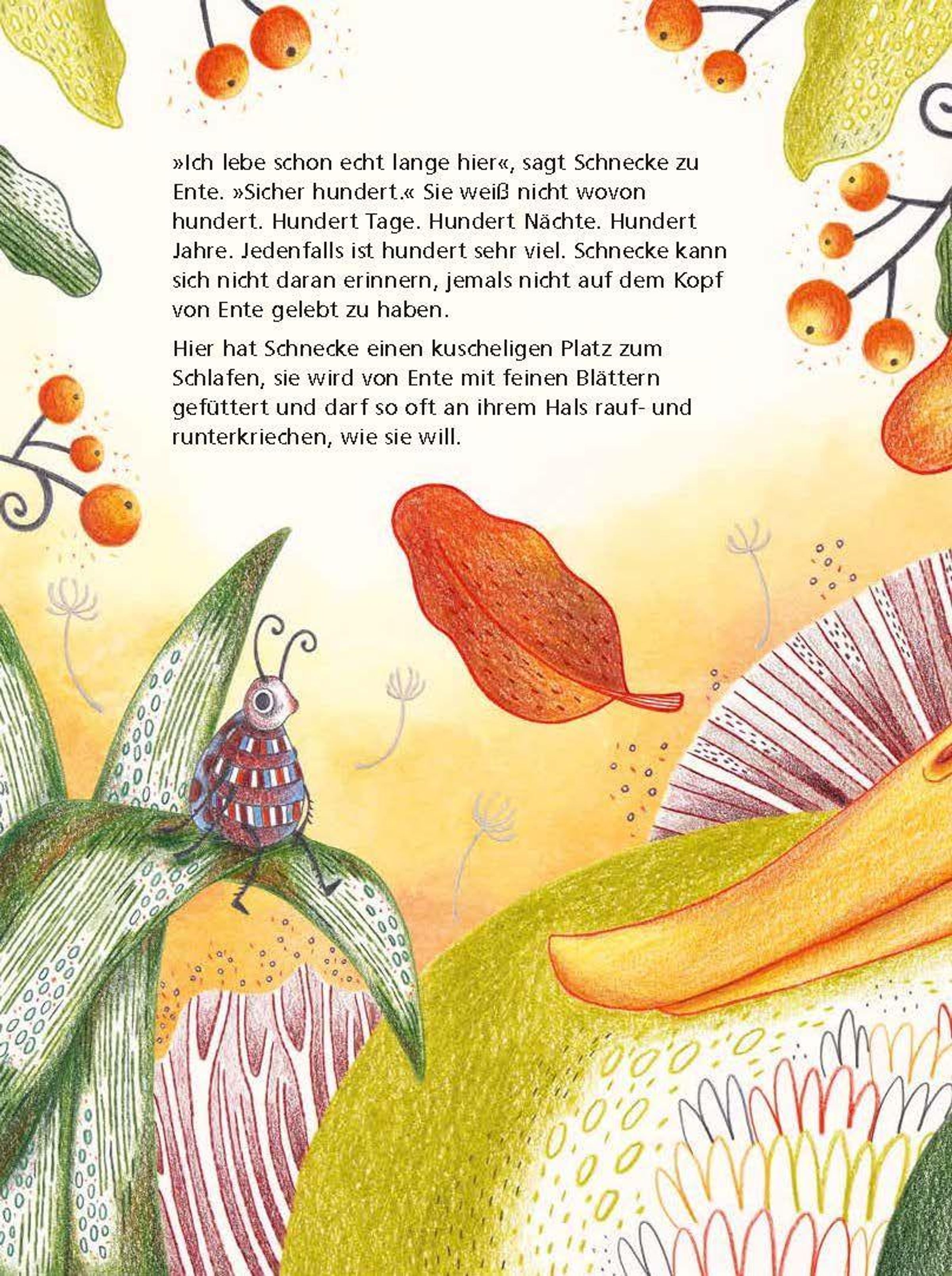 Schnecke und Ente, Ente und Schnecke - die beiden sind unzertrennlich und wissen ganz genau, was sie aneinander haben. Nur fliegen kann die Laufente leider nicht, dabei gäbe es in der Welt so vieles zu entdecken. Schneckes Fernweh wird immer größer, und eines Tages macht sie sich auf den Weg, allein. Als sie dann oben auf dem Baum sitzt und die Aussicht bewundert, fehlt ihr jedoch etwas, oder besser gesagt jemand. So kehrt sie wieder zu Ente zurück. Die nimmt nun all ihren Mut zusammen und wird plötzlich ganz leichtfüßig ... Hier kommt niemand zu kurz: die Mutigen, die Vorsichtigen, die Abenteurer*innen und die Tierliebenden. Schnecke und Ente - eine Geschichte über die ganz große Freundschaft, über Zusammenhalt, aber auch über das Loslassen und die Suche nach Freiheit. Schnecke traut sich ins Abenteuer, aber gemeinsam ist es doch am schönsten, und der Zusammenhalt gibt Ente die nötige Kraft, sich Herausforderungen zu stellen. Ein farbenprächtiges Bilderbuch für die ganze Familie vom bekannten Schweizer Kinderbuchautor Daniel Fehr und der vielseitigen Illustratorin Raffaela Schöbitz.