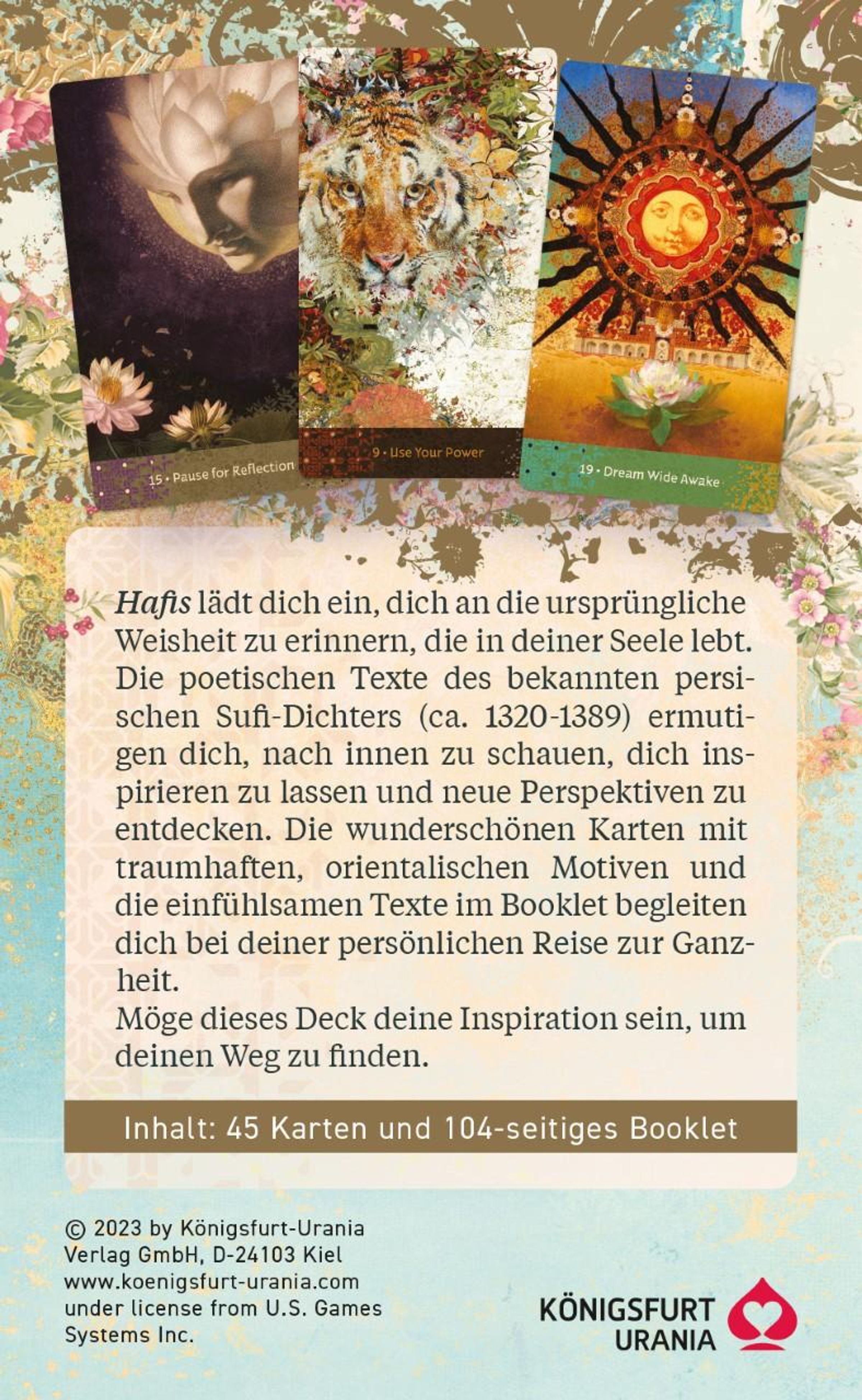 Hafis, der beliebteste Dichter der Perser, lädt dich mit seinen Versen ein, dich an die ursprüngliche Weisheit zu erinnern, die in deiner Seele lebt. Die poetischen Texte des bekannten spirituellen Lehrers und Sufi-Dichters (ca. 1320-1389) ermutigen dich, nach innen zu schauen, dich inspirieren zu lassen und neue Perspektiven zu entdecken. Jede Karte fordert dich zu etwas auf - die Texte im Booklet erklären die Hintergründe, das Ziel und den Weg. Die wunderschönen Karten mit traumhaften, orientalischen Motiven und die einfühlsamen Texte sollen ein Licht in deinem Herzen anzünden und dich begleiten auf deinem Weg zu einem angstfreien, erfüllten und entspannten Leben. Ein kluger Weiser sagte einmal über die Menschen: "Wir bringen uns alle nur gegenseitig nach Hause." Möge dieses Deck deine Inspiration sein, um deinen Weg zu finden.