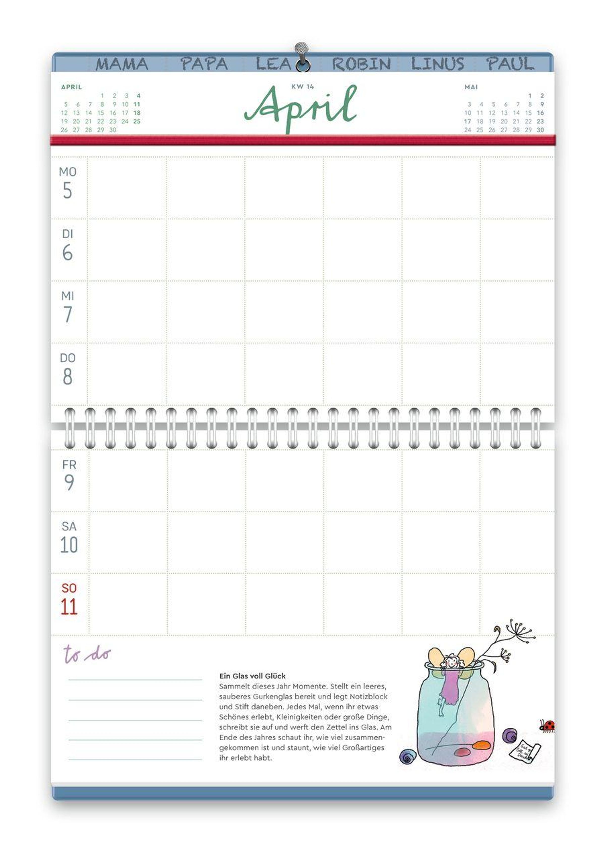 Der Kalender ist für bis zu sechs Familienmitglieder geeignet, die dank der praktischen Gestaltung nur einmal für alle Monate oben auf dem Einband eintragen werden. Das großzügige Kalendarium mit einer Woche pro Doppelseite bietet viel Platz für Termine und ToDos. Zu den hilfreichen Listen und Übersichten im Anhang gehören u. a. Stundenpläne, Urlaubspackliste, Haushaltsdienste, Gemüsekalender, Ferientermine und eine Jahresübersicht.