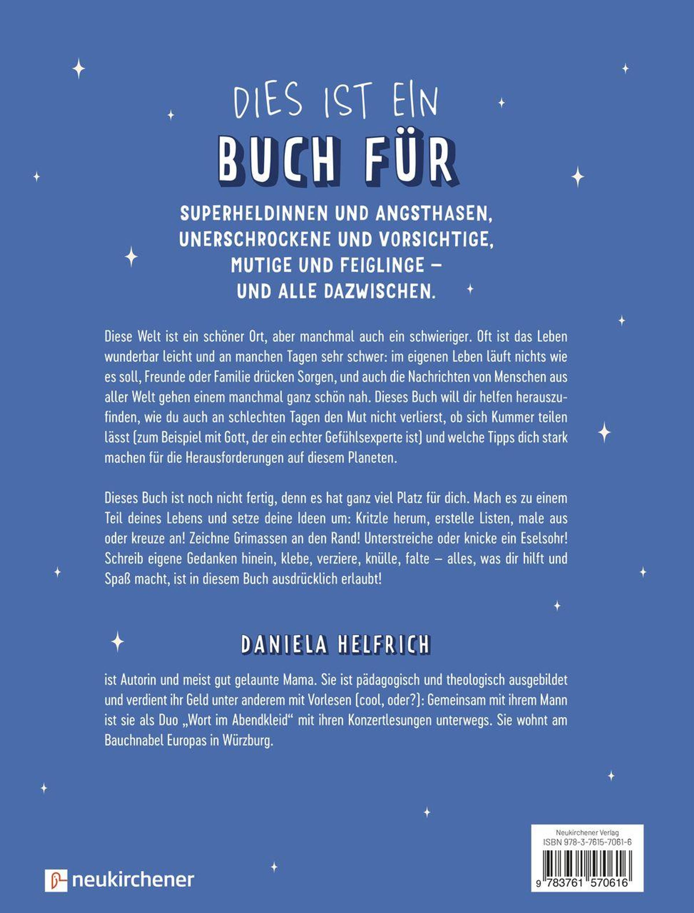 Über das Buch-Konzept: Dieses Buch thematisiert schwierige Themen wie Leid, Krieg, Katastrophen und Krisen altersgerecht und verständlich. Es lässt Kinder durch die interaktiven Mitmachseiten Handlungsspielraum erleben und eigene Lösungsansätze finden, statt sich als Opfer der Umstände zu fühlen. Es möchte helfen, emotionale Kompetenz sowie Selbstwirksamkeitsgefühl, Resilienz und mentale Gesundheit zu stärken und ermöglicht Gefühle zu erkennen, zu hinterfragen, zu bewältigen und an das Buch abzugeben. Darüber hinaus weist es auf weitere Hilfsangebote hin, an die sich Kinder bei Bedarf wenden können. Es bringt Kindern Gott näher und lässt sie Glauben als eine Möglichkeit erleben, kleine Alltagskrisen und globale Katastrophenmeldungen zu meistern. Es kann nicht nur zuhause, sondern auch in Schule, Jugendarbeit sowie Therapie und Seelsorge eingesetzt werden.