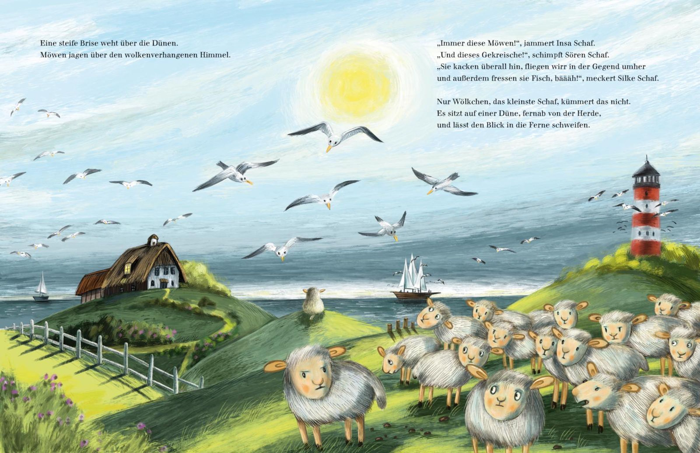 Wölkchen, das kleinste Schaf der Herde, träumt von Freiheit und Weite - und verirrt sich dabei in die Dünen an der Küste. Dort trifft es völlig allein auf Mio Möwe, die das verirrte Schaf neugierig beobachtet. Obwohl Schafe und Möwen einander eigentlich aus dem Weg gehen, entsteht zwischen den beiden eine besondere Freundschaft. Gemeinsam finden sie den Weg zurück, und sogar Möwen und Schafe rücken etwas näher zusammen.