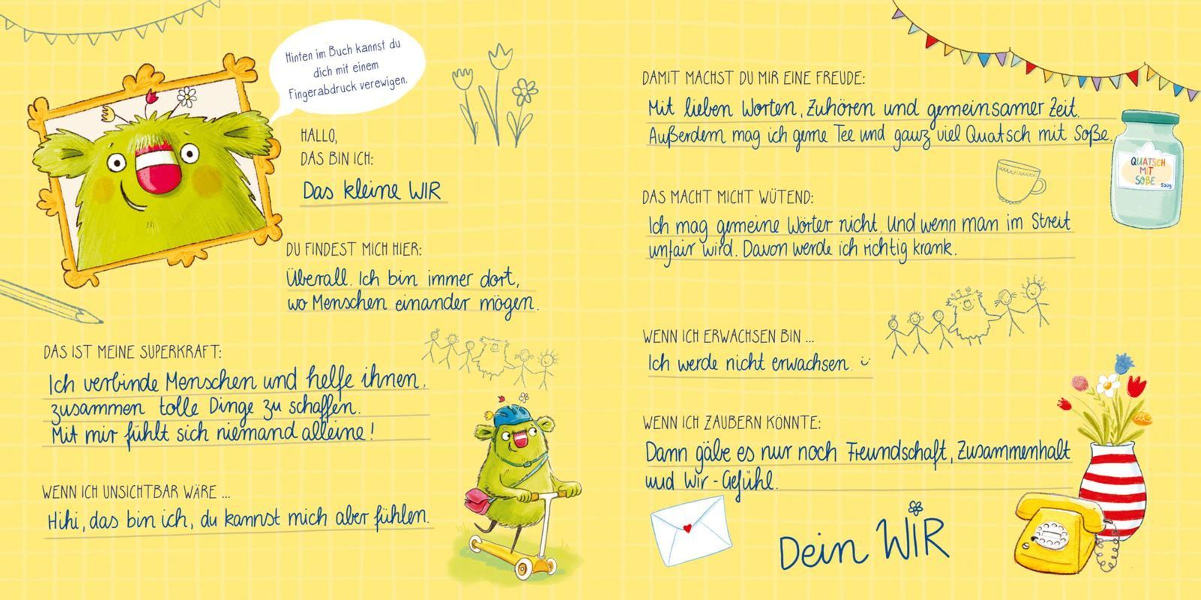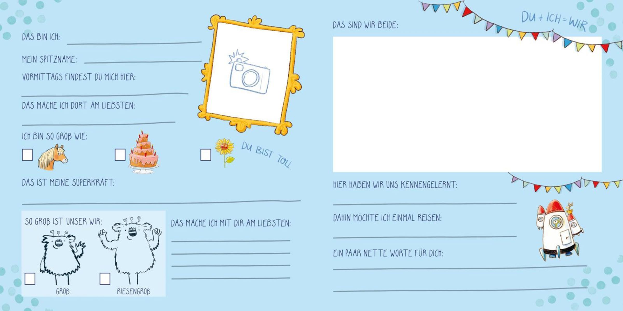 Mit dem kleinen WIR Erinnerungen an die Kita-Zeit festhaltenOb Krippe, Kita, Krabbelgruppe oder Kindergarten - hier entstehen die dicksten Freundschaften. Deswegen fühlt sich das WIR dort groß, stark und mutig. Die liebenswerte Figur der bekannten Bilderbücher verkörpert, was für Kinder oft noch zu abstrakt ist: Den Begriff des Gemeinschaftsgefühls. In diesem liebevoll gestalteten Freundschaftsbuch ist das kleine WIR immer mit dabei. Jede Doppelseite bietet Kindergartenkindern spannende und witzige Fragen, viel Platz zum Klecksen, Ankreuzen, Malen, Kleben und Kreativwerden. Und das tolle Gefühl, alle Freund*innen mit nach Hause nehmen zu können!