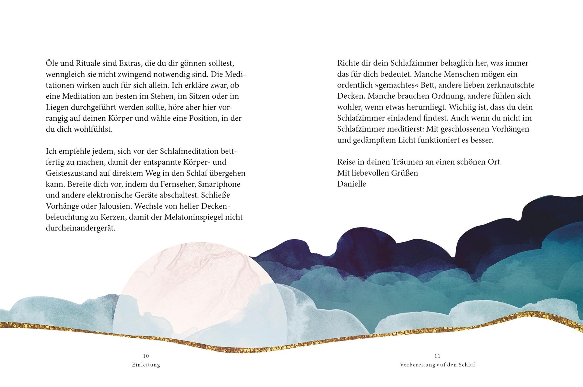 Das Gedankenkarussell raubt Ihnen den Schlaf? Dieses wunderschön illustrierte Meditations-Buch unterstützt Sie dabei Ruhe zu finden und besser einzuschlafen! Kurze Rituale und ätherische Öle stimmen Sie auf die Meditationen ein und helfen Ihnen dabei, Alltagssorgen hinter sich zu lassen. Ob Atemübungen, eine Gedankenreise an einen stillen See oder Licht-Visualisierungen - mit den 15 Schlaf-Meditationen stimmen Sie sich sanft auf die Nachtruhe ein.