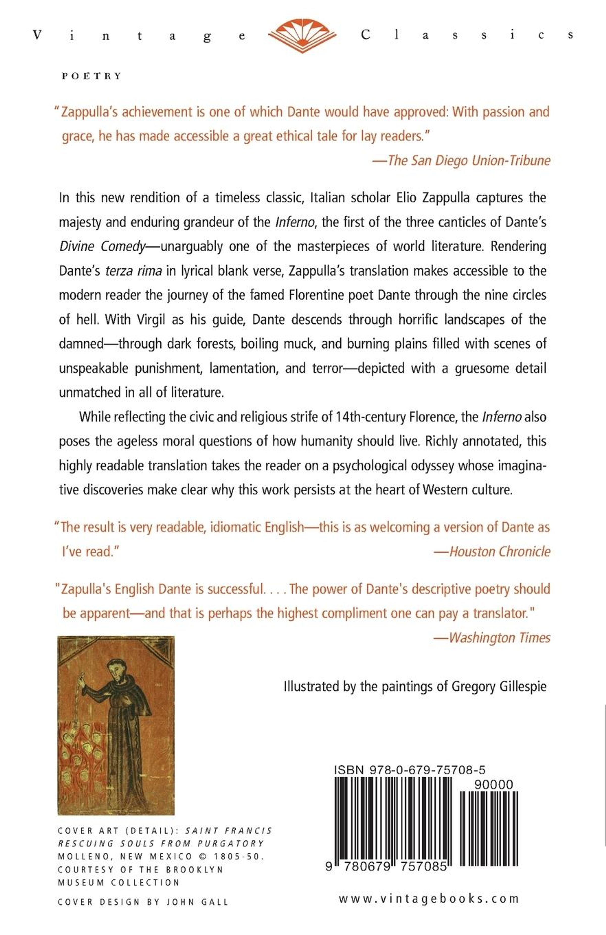 In this new rendition of a timeless classic, Italian scholar Elio Zappulla captures the majesty and enduring power of the Inferno, the first of the three canticles of Dante's The Divine Comedy, unarguably one of the masterpieces of world literature. Rendering Dante's terza rima into lyrical blank verse, Zappulla's translation makes accessible to the modern reader the journey of the famed Florentine poet Dante through the nine circles of hell. With Virgil at his side, the great poet descends through horrific landscapes of the damned--dark forests, boiling muck, and burning plains filled with unspeakable punishment, lamentation, and terror--depicted with gruesome detail unmatched in all literature. Richly annotated, this translation takes even the first-time reader on a truth-seeking journey whose imaginative and psychological discoveries make clear why this work persists at the heart of Western culture.