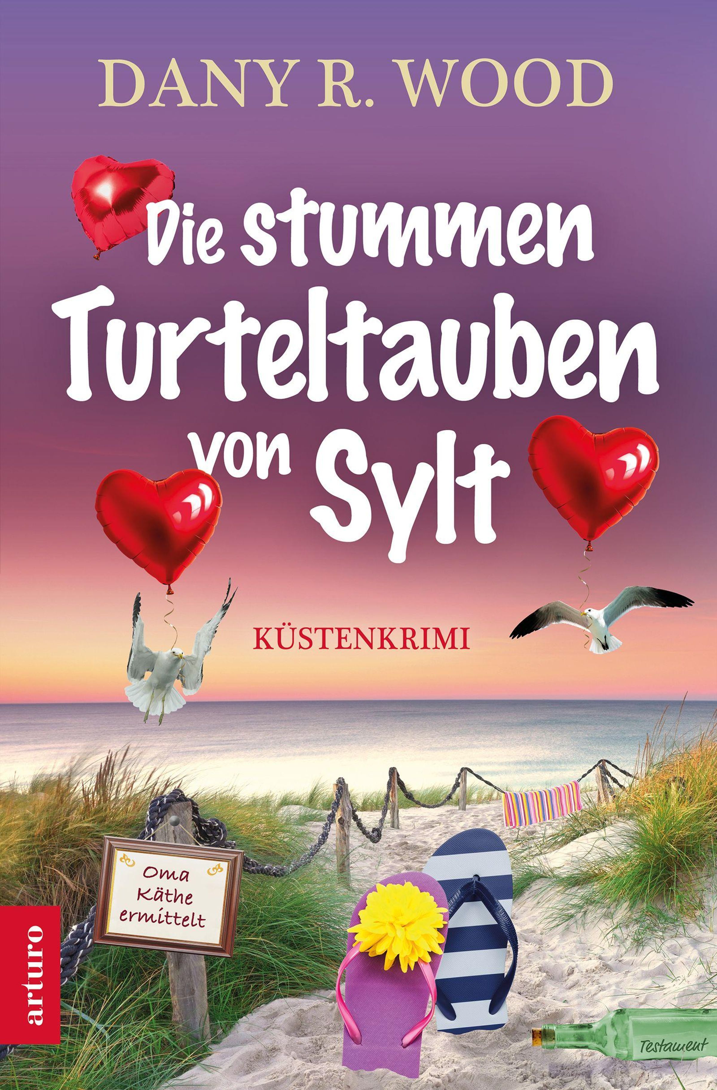 „Die stummen Turteltauben von Sylt“, Küstenkrimi, „Oma Käthe ermittelt“. Zwei Möwen mit Herzballons, Strandszenerie., Buch