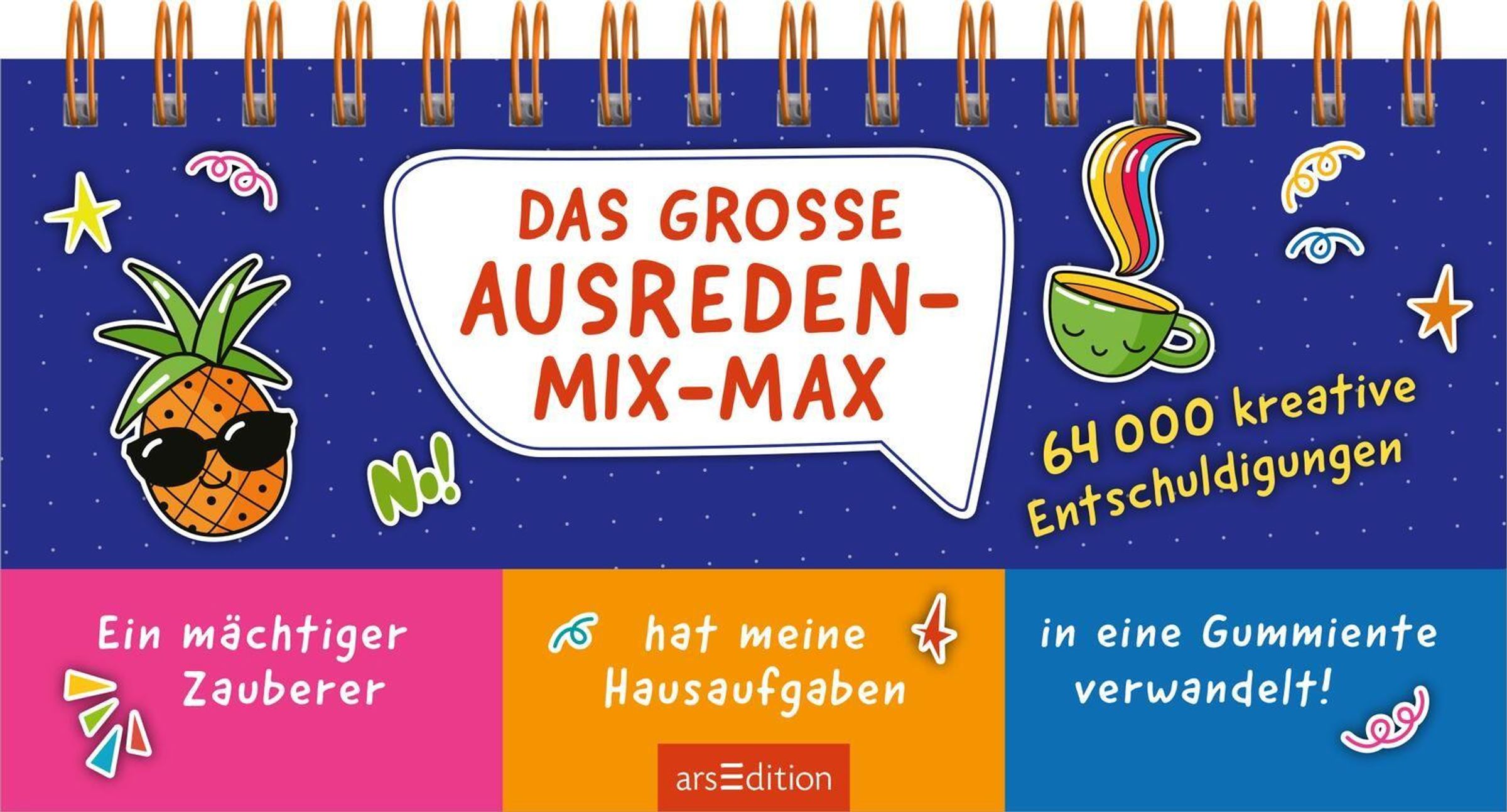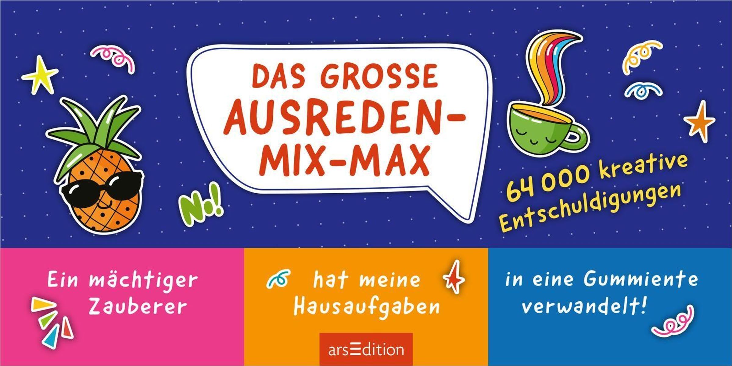 „DAS GROSSE AUSREDEN-MIX-MAX“, „64 000 kreative Entschuldigungen“, Illustrationen: Ananas, Kaffeetasse., Buch