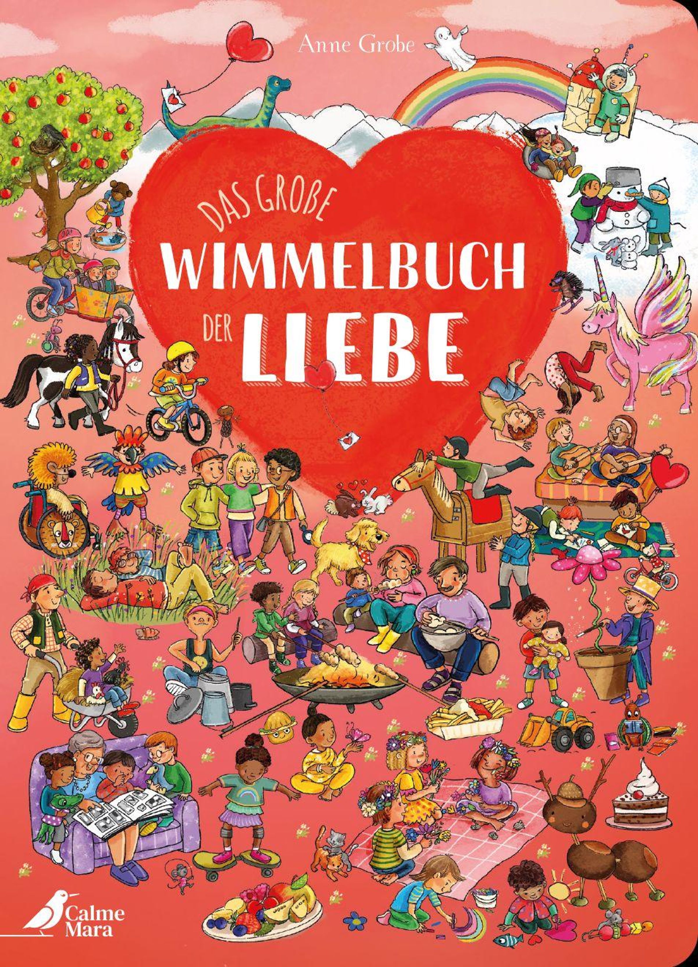 „Das große Wimmelbuch der Liebe“ steht in weißer Schrift auf einem roten Herz. Bunte Szenen mit spielenden Menschen., Buch