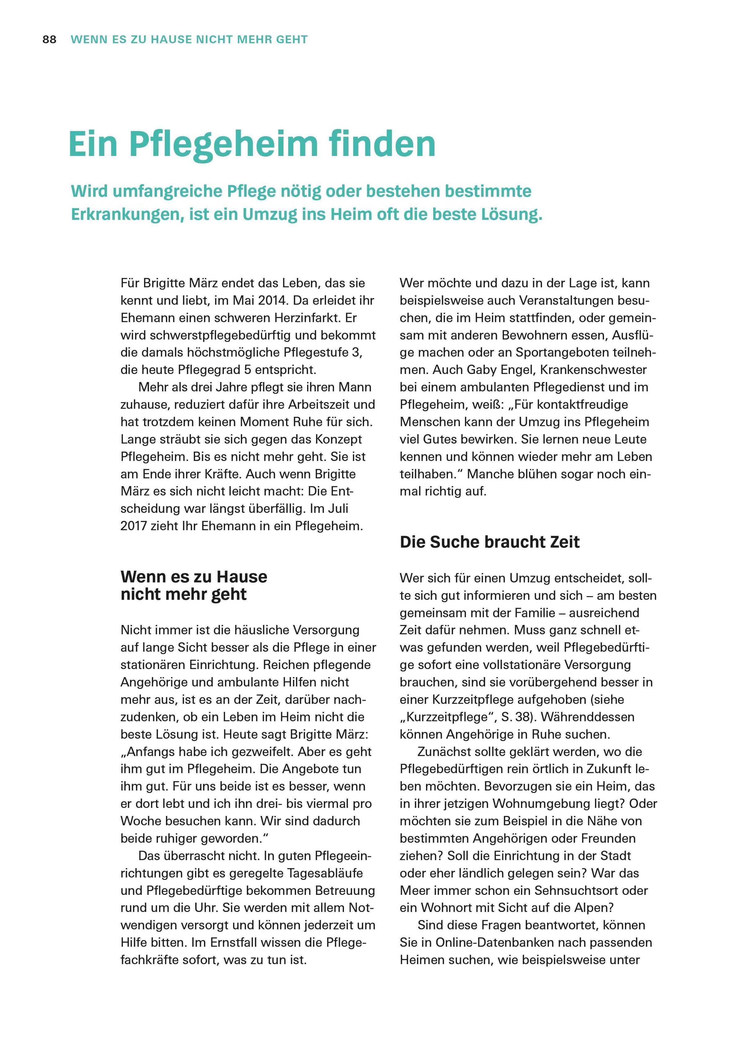 Umso hilfreicher ist ein Ratgeber, der ganz praktische Unterstützung leistet und schnell und übersichtlich Antworten auf die wichtigsten Fragen bietet: Wie lässt sich Pflege organisieren? Wo gibt es finanzielle Unterstützung? Wer berät? Und wie können wir entscheiden, ob wir zu Hause pflegen oder ob ein Pflegeheim die bessere Lösung ist? Welche Alternativen gibt es zum Pflegeheim?