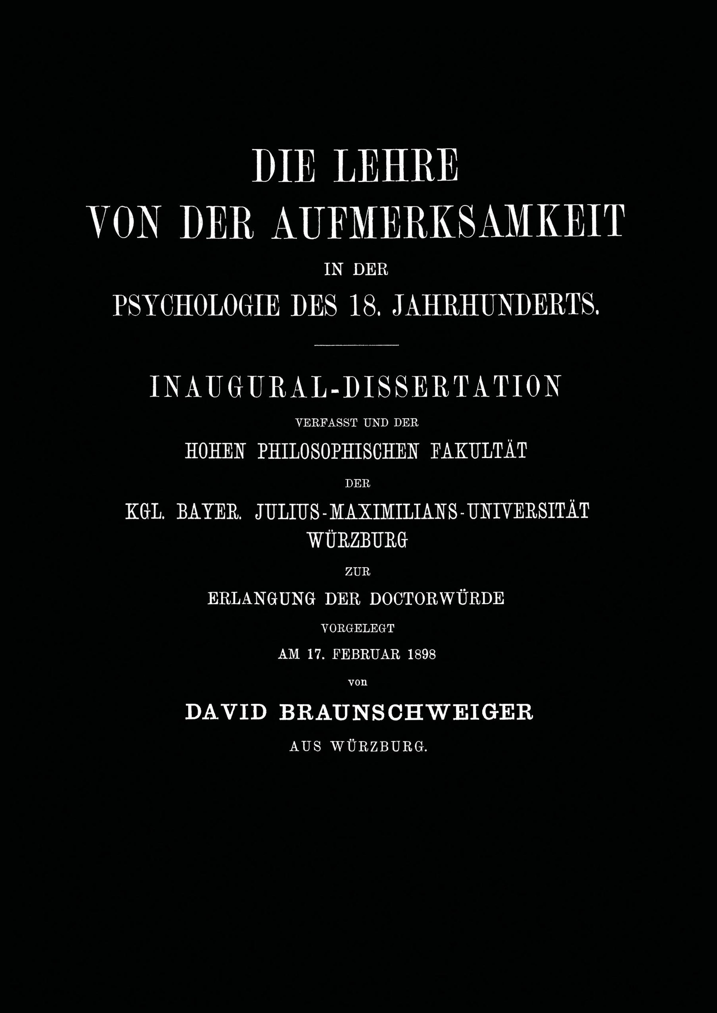 Inaugural-Dissertation verfasst und der hohen Philosophischen Fakultät der königlichen Bayerischen Julius-Maximilians-Universität Würzburg zur Erlangung der Doctorwürde vorgelegt am 17. Februar 1898 von David Braunschweiger aus Würzburg. Sorgfältig lektorierter, reprofotografischer Nachdruck der Erstauflage von 1899. Inhalt: Vorwort; Einleitung; 1. Sinnliche und intellectuelle Aufmerksamkeit - Wesen der Aufmerksamkeit; 2. Grade und Eigenschaften der Aufmerksamkeit; 3. Reize der Aufmerksamkeit - Willkürliche und unwillkürliche Aufmerksamkeit; 4. Das physiologische Correlat der Aufmerksamkeit; 5. Wirkungen der Aufmerksamkeit; 6. Verbesserung der Aufmerksamkeit; 7. Verringerung und Verhinderung der Aufmerksamkeit; Schluss; Quellen- und Litteraturverzeichnis; Berichtigungen; Vita