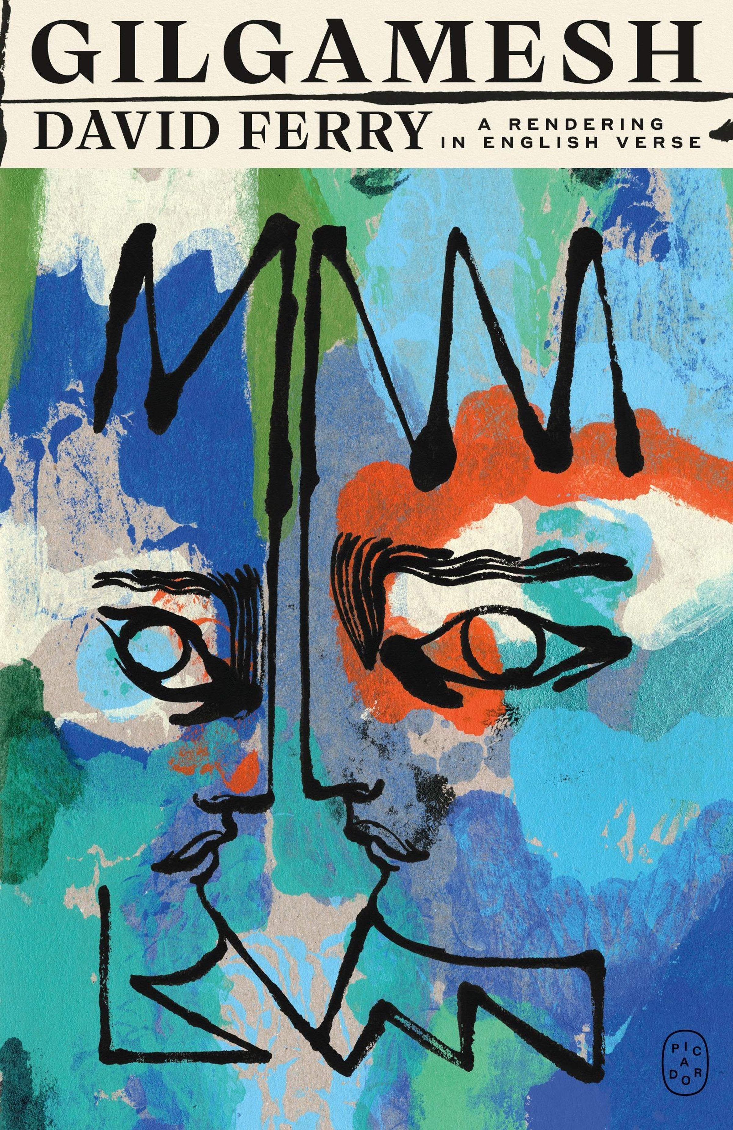 Text: "GILGAMESH DAVID FERRY A Rendering in English Verse." Bunte Illustration mit abstraktem Gesicht, stark umrissene Augen., Buch