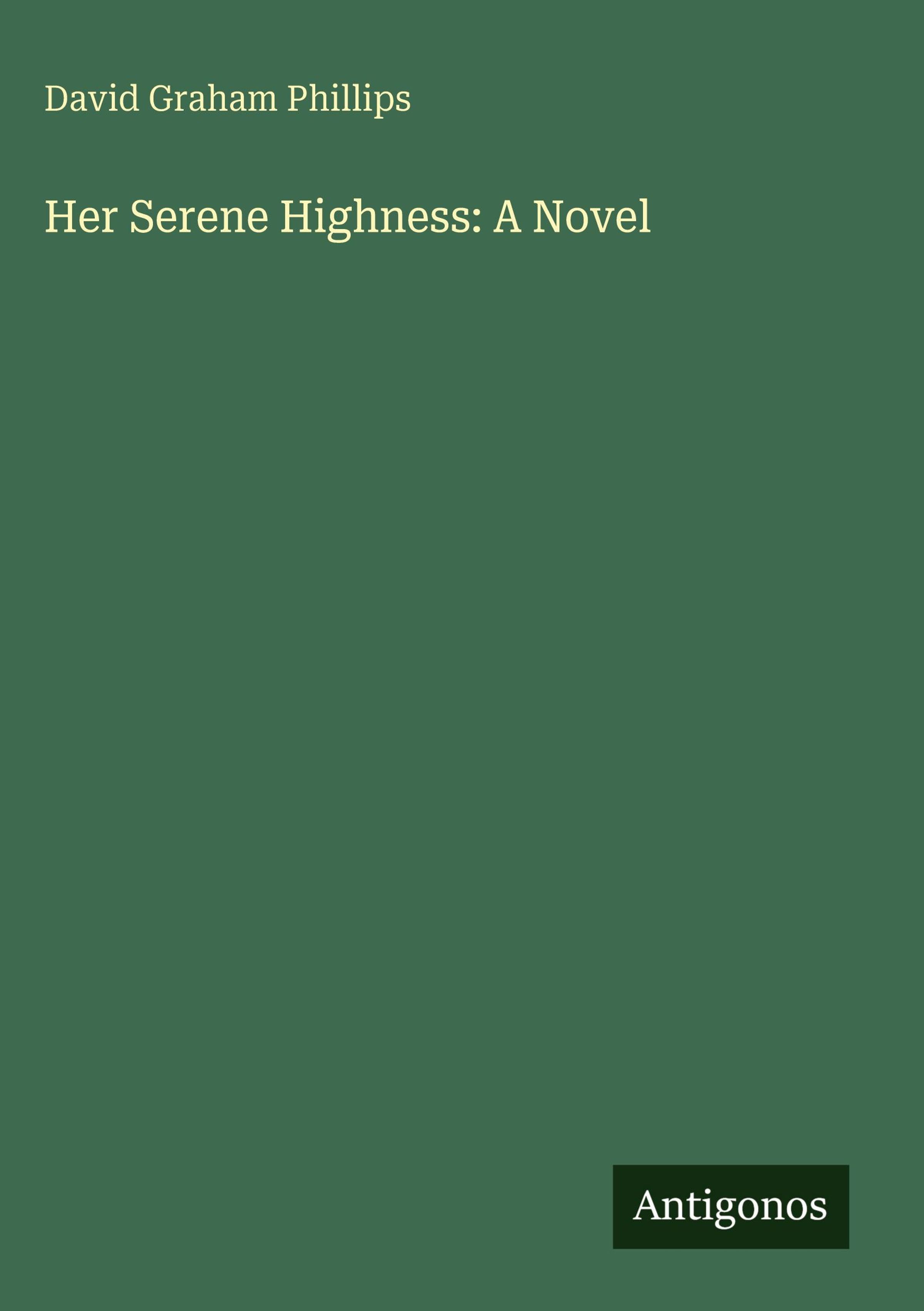 Grüner Hintergrund mit Text. Oben: "David Graham Phillips". Mitte: "Her Serene Highness: A Novel". Unten rechts: "Antigonos"., Buch