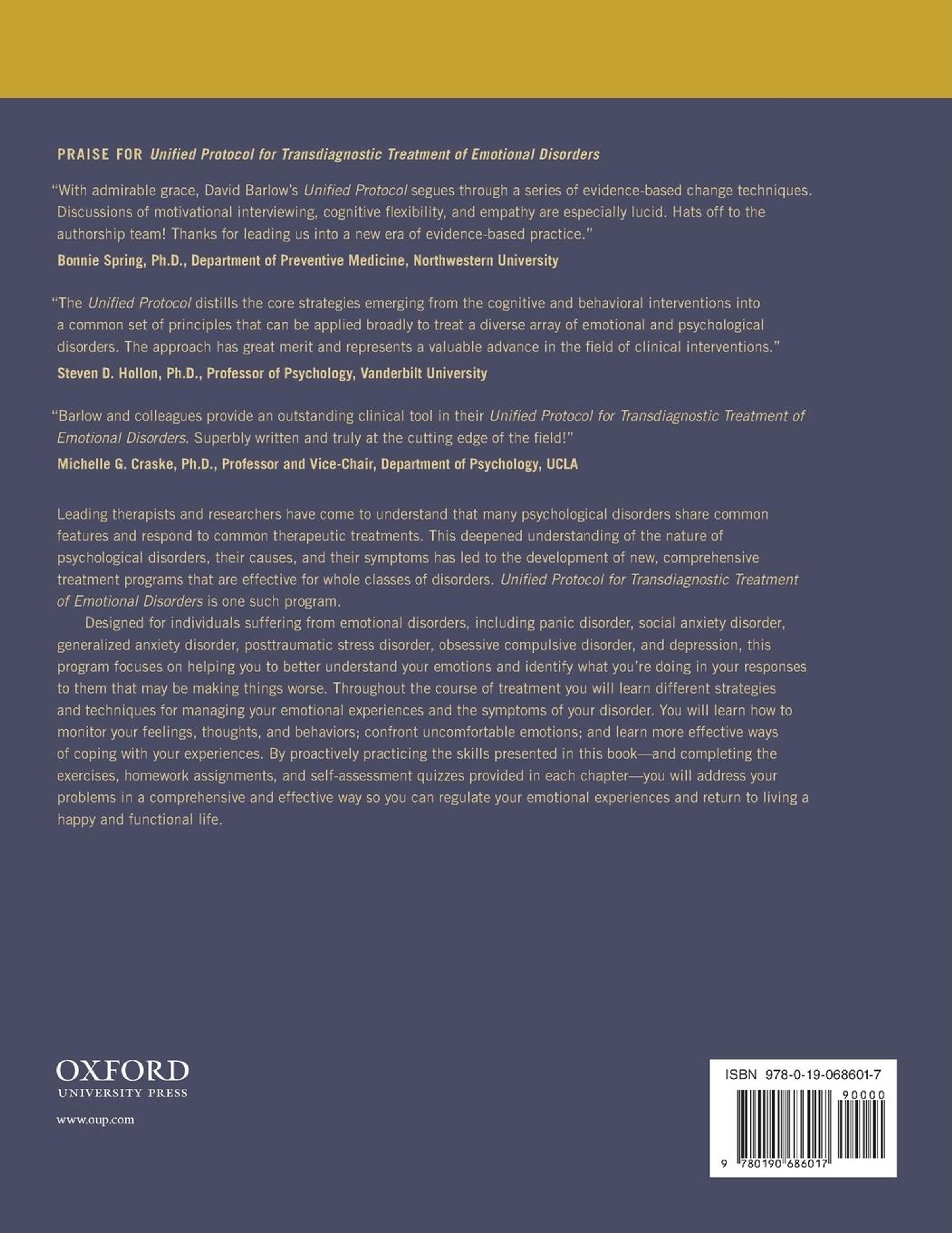 Leading therapists and researchers have come to understand that many psychological disorders share common features and respond to common therapeutic treatments. This deepened understanding of the nature of psychological disorders, their causes, and their symptoms has led to the development of new, comprehensive treatment programs that are effective for whole classes of disorders. Unified Protocol for Transdiagnostic Treatment of Emotional Disorders is one such program. Designed for individuals suffering from emotional disorders, including panic disorder, social anxiety disorder, generalized anxiety disorder, posttraumatic stress disorder, obsessive compulsive disorder, and depression, this program focuses on helping you to better understand your emotions and identify what you're doing in your responses to them that may be making things worse. Throughout the course of treatment you will learn different strategies and techniques for managing your emotional experiences and the symptoms of your disorder. You will learn how to monitor your feelings, thoughts, and behaviors; confront uncomfortable emotions; and learn more effective ways of coping with your experiences. By proactively practicing the skills presented in this book-and completing the exercises, homework assignments and self-assessment quizzes provided in each chapter, you will address your problems in a comprehensive and effective way so you can regulate your emotional experiences and return to living a happy and functional life.