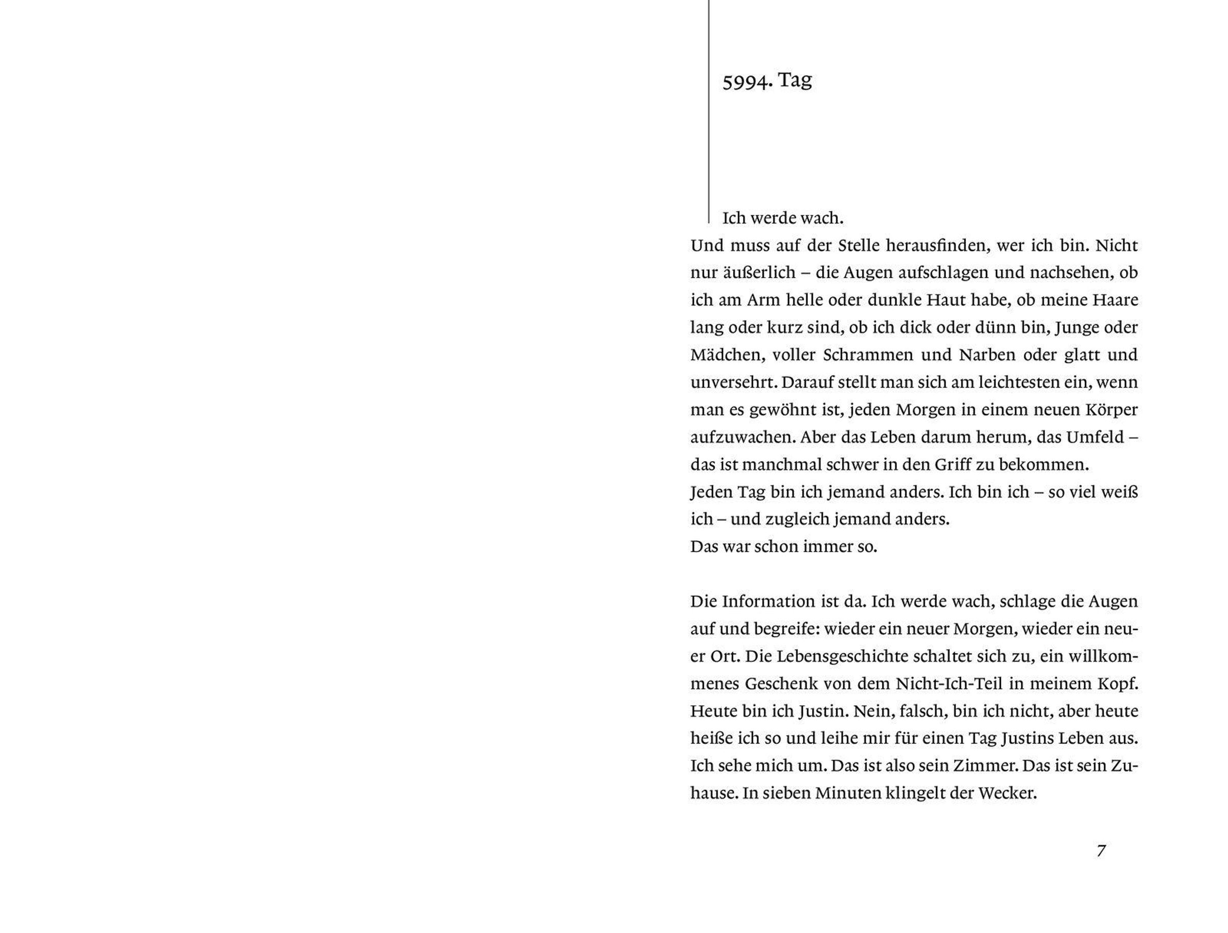 Jeden Morgen wacht A in einem anderen Körper auf, in einem anderen Leben. Nie weiß er vorher, wer er heute ist. A hat sich an dieses Leben gewöhnt, und er hat Regeln aufgestellt: Lass dich niemals zu sehr darauf ein. Falle nicht auf. Hinterlasse keine Spuren. Doch dann verliebt A sich unsterblich in Rhiannon. Mit ihr will er sein Leben verbringen, für sie ist er bereit, alles zu riskieren - aber kann sie jemanden lieben, dessen Schicksal es ist, jeden Tag ein anderer zu sein?