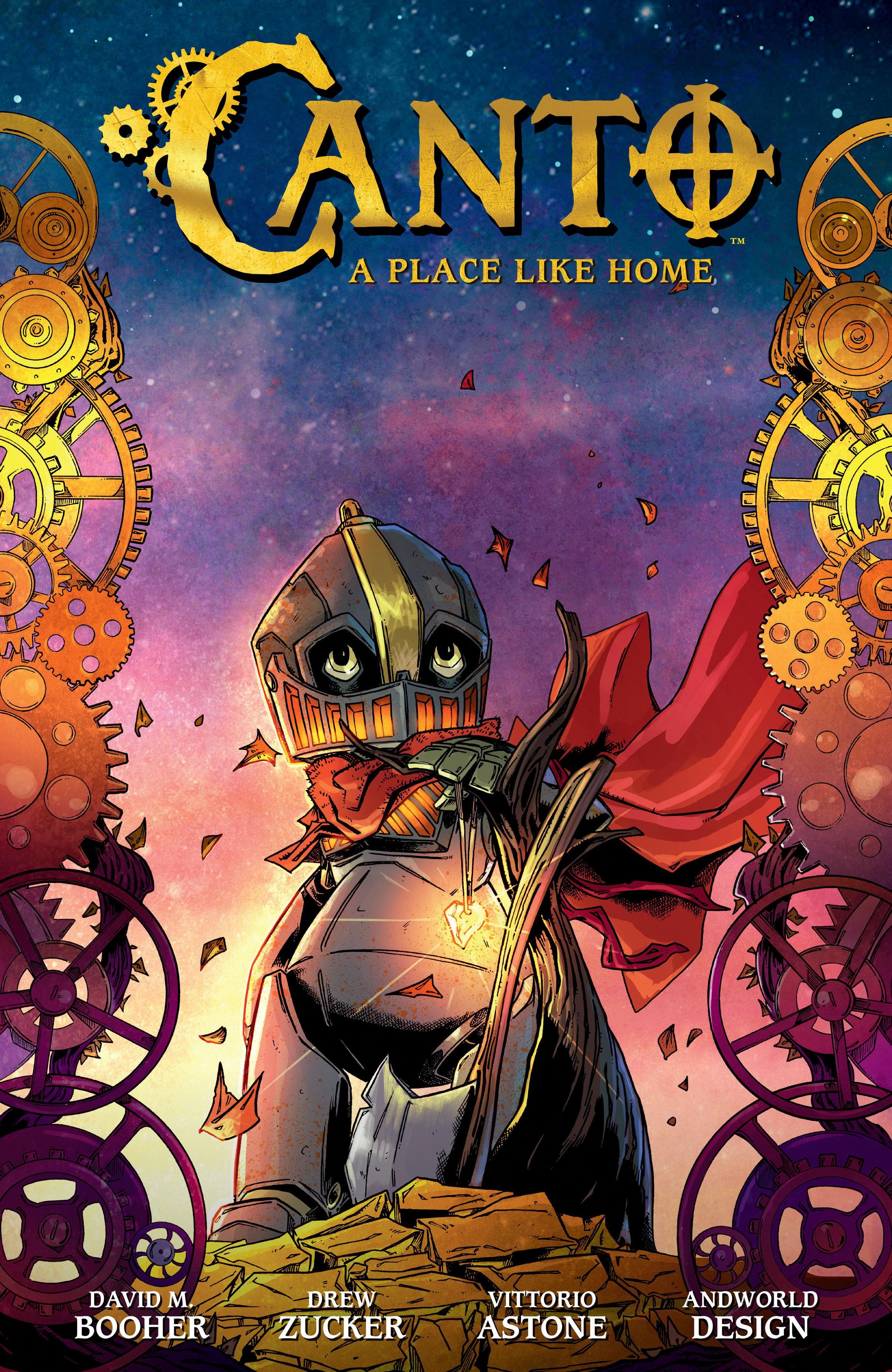 „CANTO: A PLACE LIKE HOME“. Roboter-Ritter mit rotem Schal umgeben von Zahnrädern auf buntem Hintergrund., Buch
