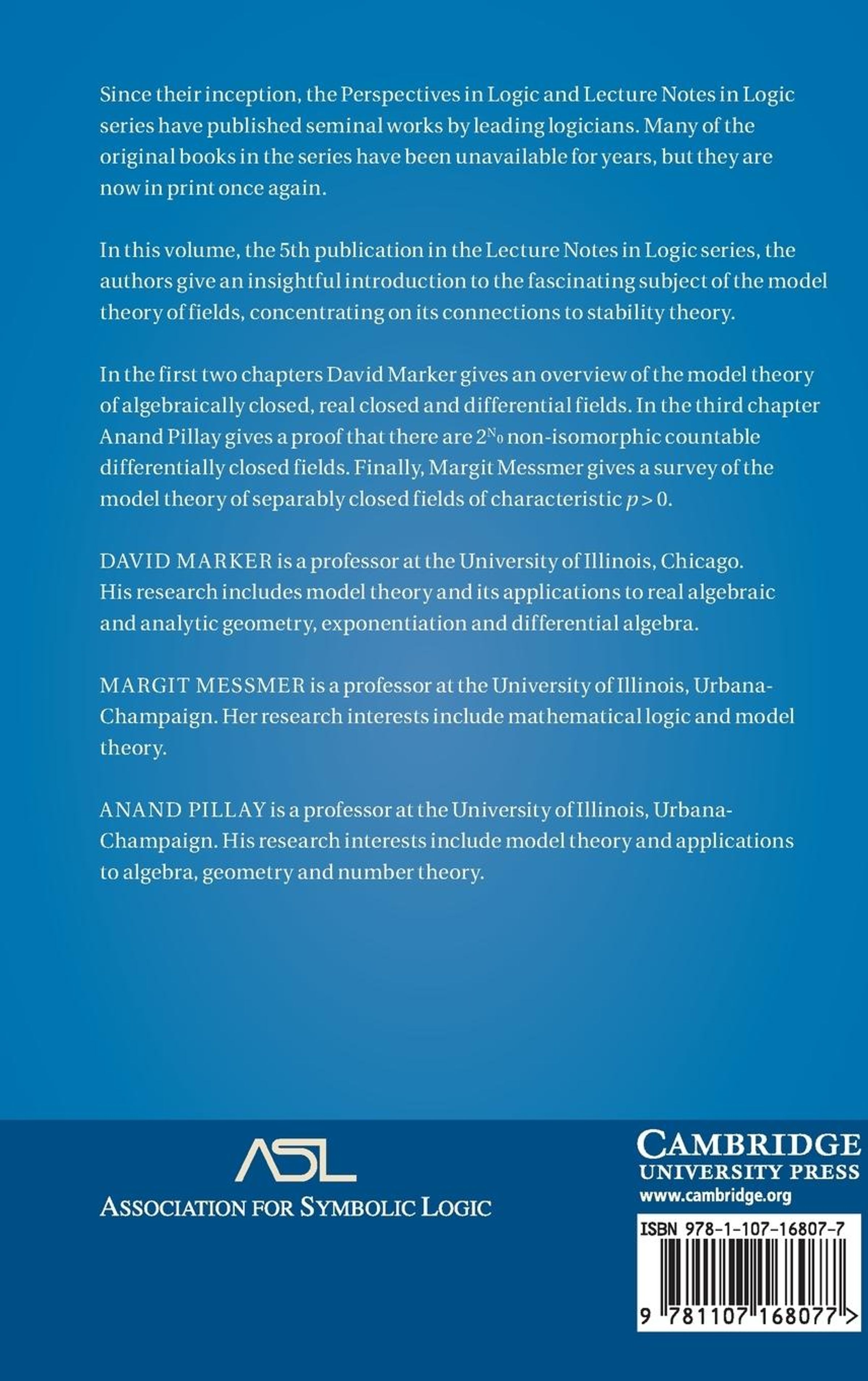 Since their inception, the Perspectives in Logic and Lecture Notes in Logic series have published seminal works by leading logicians. Many of the original books in the series have been unavailable for years, but they are now in print once again. In this volume, the fifth publication in the Lecture Notes in Logic series, the authors give an insightful introduction to the fascinating subject of the model theory of fields, concentrating on its connections to stability theory. In the first two chapters David Marker gives an overview of the model theory of algebraically closed, real closed and differential fields. In the third chapter Anand Pillay gives a proof that there are 2 non-isomorphic countable differential closed fields. Finally, Margit Messmer gives a survey of the model theory of separably closed fields of characteristic p > 0.