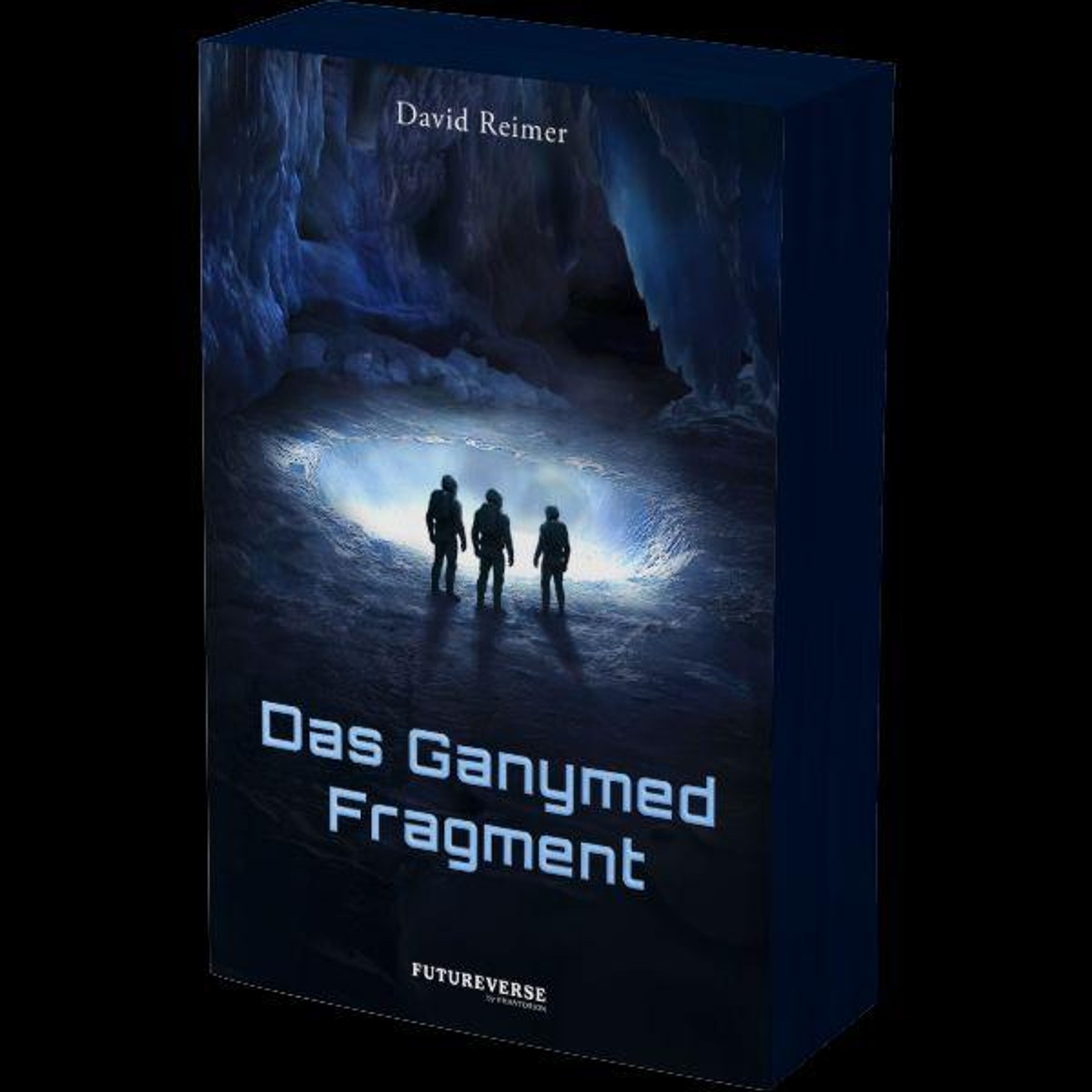"Das Ganymed Fragment" von David Reimer. Drei Personen stehen vor einem leuchtenden Krater in einer blauen Höhlenlandschaft., Buch