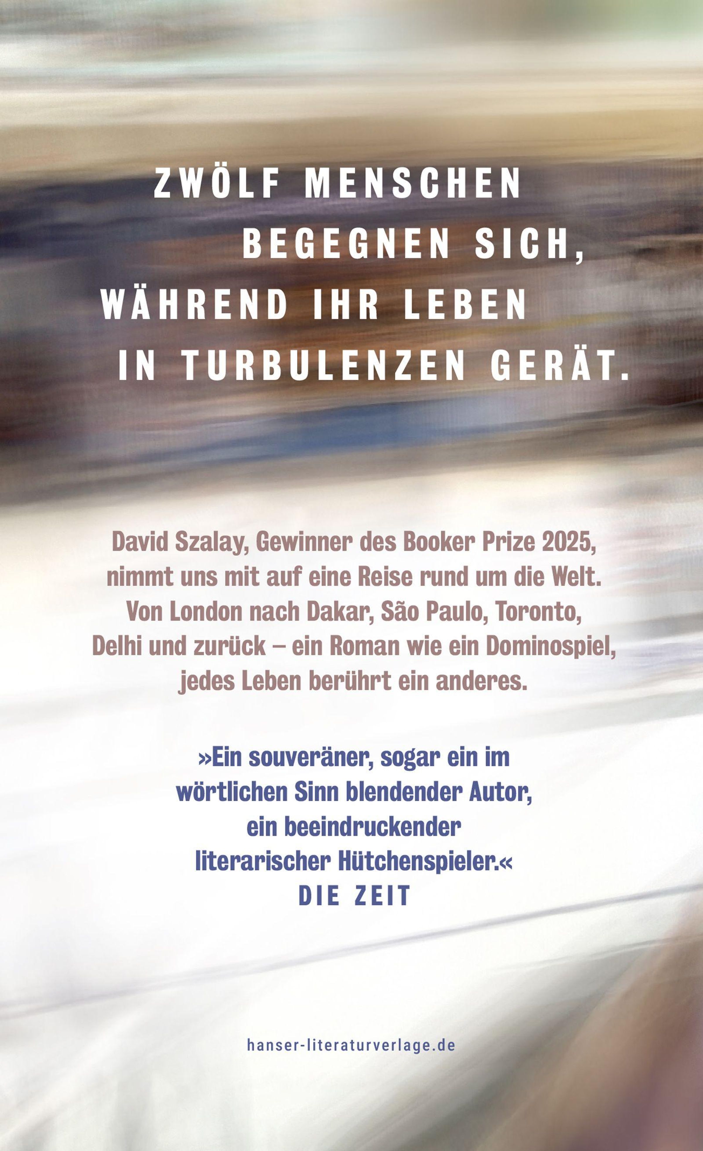 Ein Roman wie ein Dominospiel: Jedes Leben berührt ein anderes. Zwölf Menschen begegnen sich, während ihr Leben in Turbulenzen gerät. Auf dem unruhigen Flug nach Madrid kommt eine Frau, die ihren krebskranken Sohn in London besucht hat, mit ihrem Sitznachbarn ins Gespräch. Der Geschäftsmann aus dem Senegal weiß noch nicht, dass ihn in Dakar die Nachricht eines tragischen Unfalls erwartet, bei dem ein Frachtpilot Zeuge wurde. In diesem höchst spannenden Roman berührt jedes Leben das nächste, ob es der indische Golfer ist, der seinen senilen Vater bestiehlt, oder die Tochter einer ausgewanderten Deutschen, die einen syrischen Flüchtling heiraten will. Mit magischer Schwerelosigkeit nimmt uns der international gefeierte Autor David Szalay mit auf eine Reise rund um die Welt.
