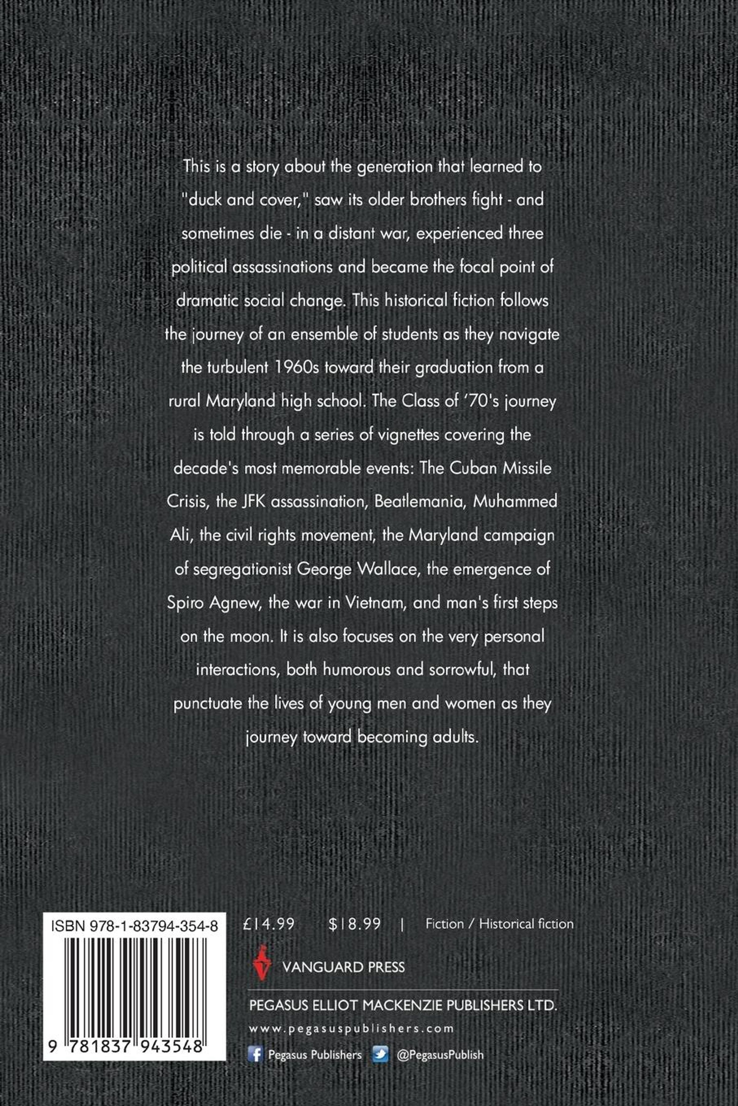 This is a story about the generation that learned to "duck and cover," saw its older brothers fight - and sometimes die - in a distant war, experienced three political assassinations and became the focal point of dramatic social change. This historical fiction follows the journey of an ensemble of students as they navigate the turbulent 1960s toward their graduation from a rural Maryland high school. The Class of '70's journey is told through a series of vignettes covering the decade's most memorable events: The Cuban Missile Crisis, the JFK assassination, Beatlemania, Muhammed Ali, the civil rights movement, the Maryland campaign of segregationist George Wallace, the emergence of Spiro Agnew, the war in Vietnam, and man's first steps on the moon. It is also focuses on the very personal interactions, both humorous and sorrowful, that punctuate the lives of young men and women as they journey toward becoming adults.