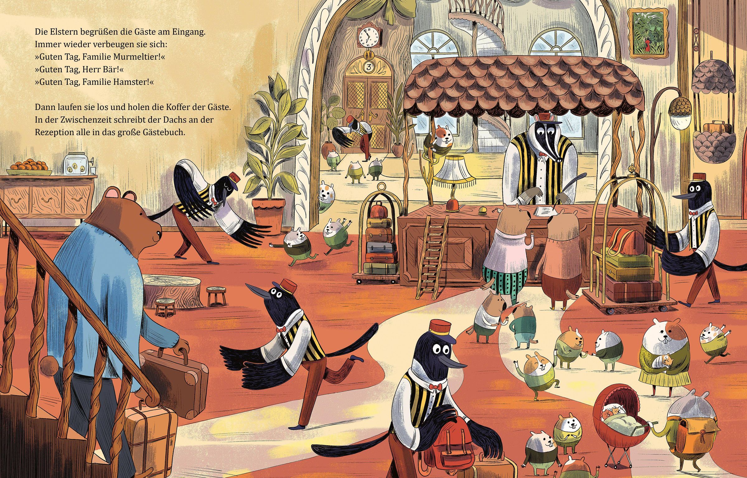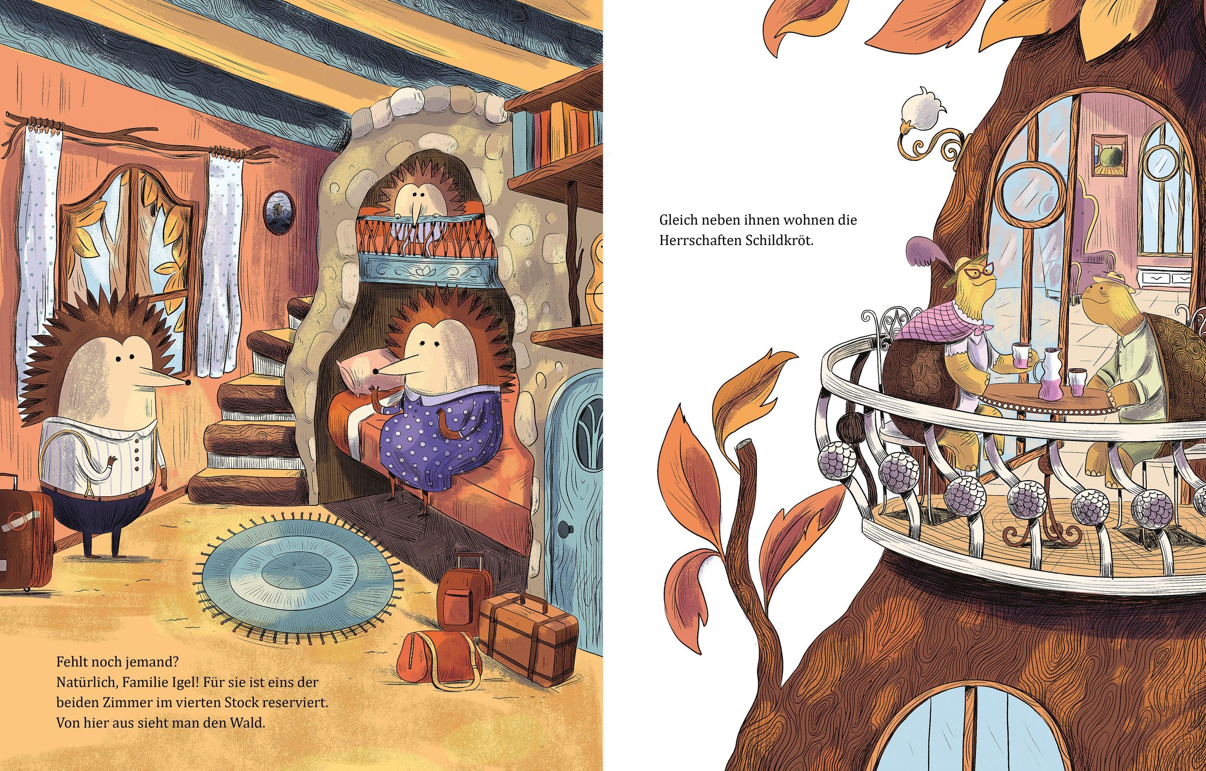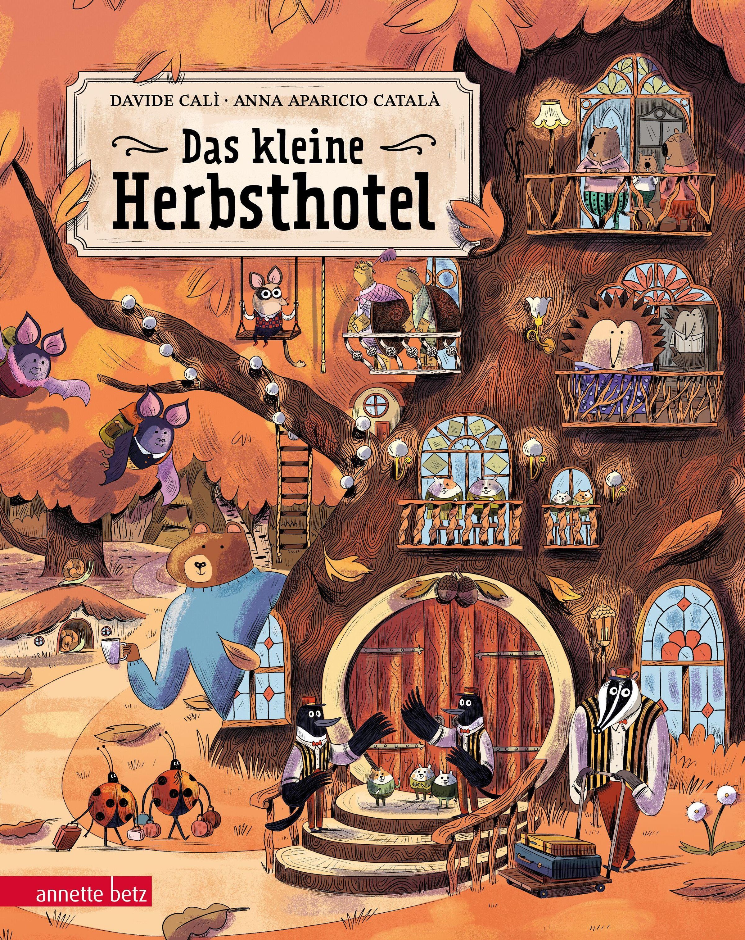 „Das kleine Herbshotel“ von Davide Calì und Anna Aparicio Català. Illustration eines Baumhotels mit Tiergästen., Buch