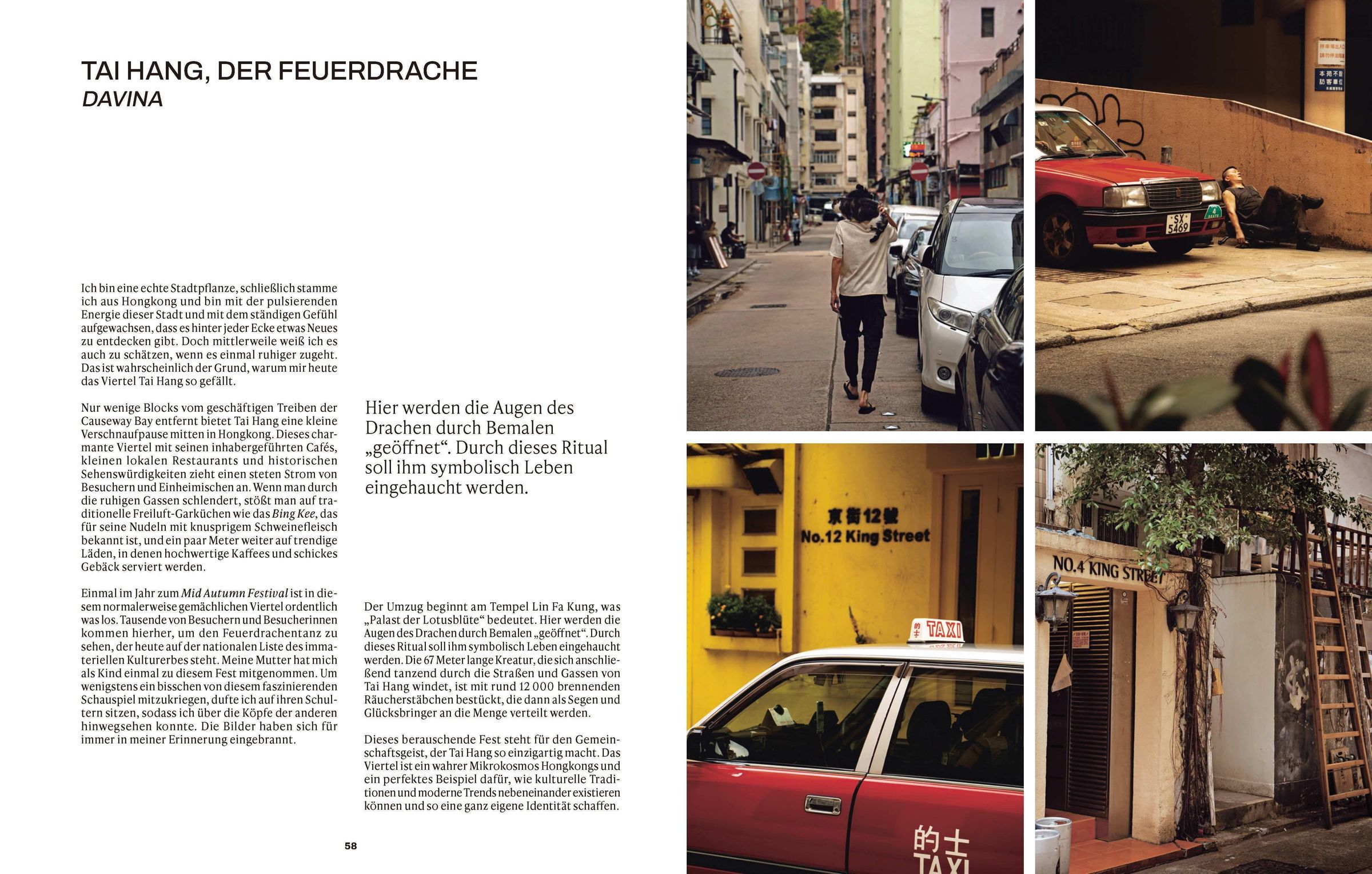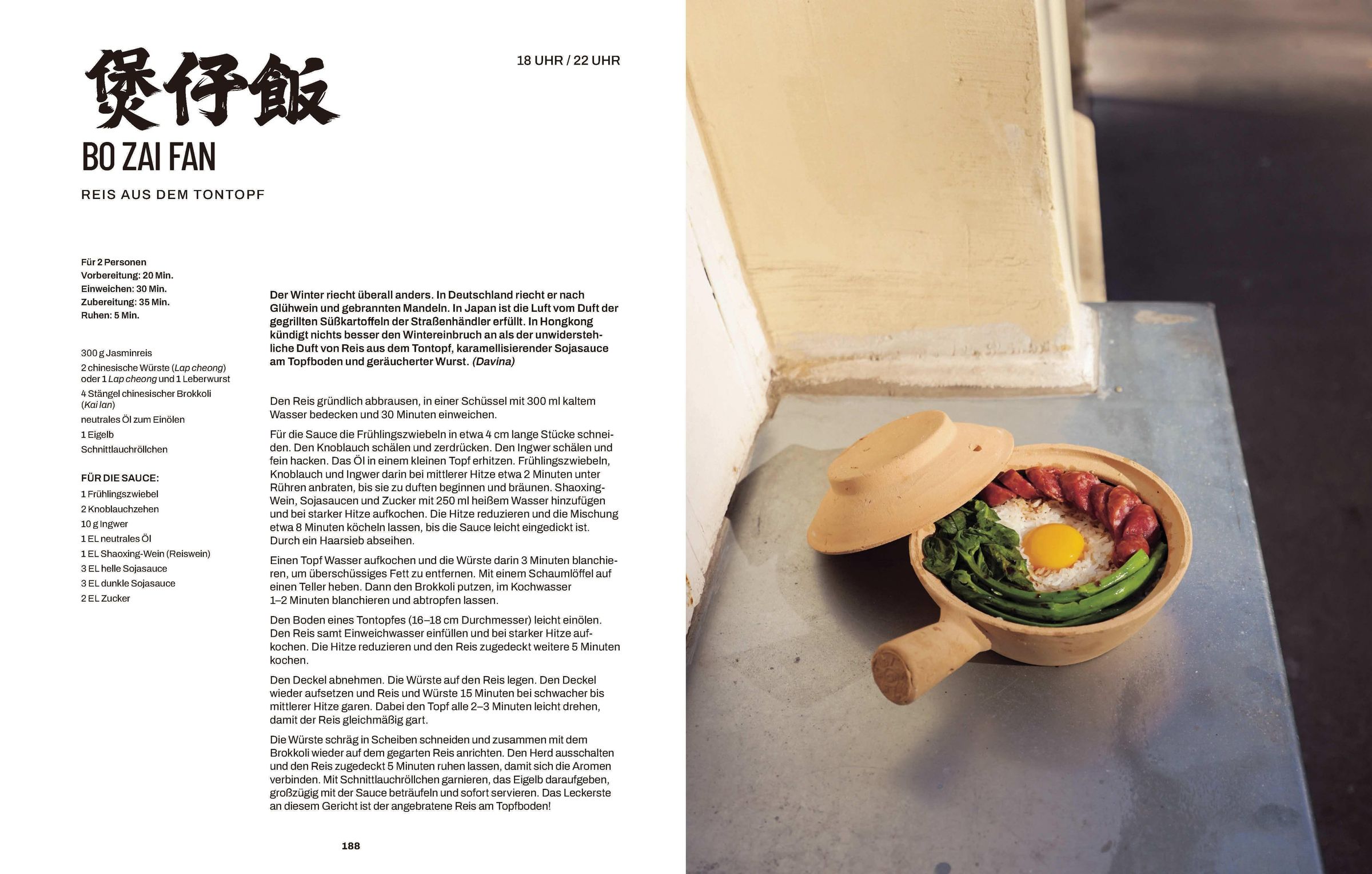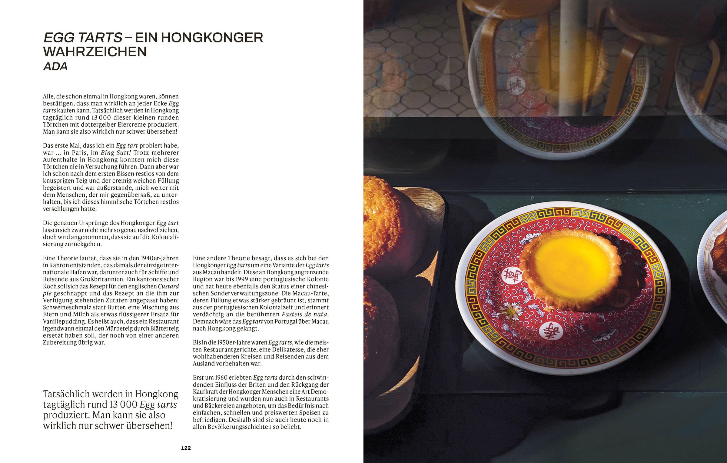 Rezepte für Congee, Curry-Fischbällchen, knusprig gegrillte Gans oder die legendären Egg Tarts erzählen von einer reichen Esskultur , geprägt von Vielfalt und Geschichte. Persönliche Essays verweben Erinnerungen, Anekdoten und kulturelle Einblicke mit atmosphärischen Fotografien der Stadt und schaffen so ein sinnliches Porträt einer Metropole im Wandel.