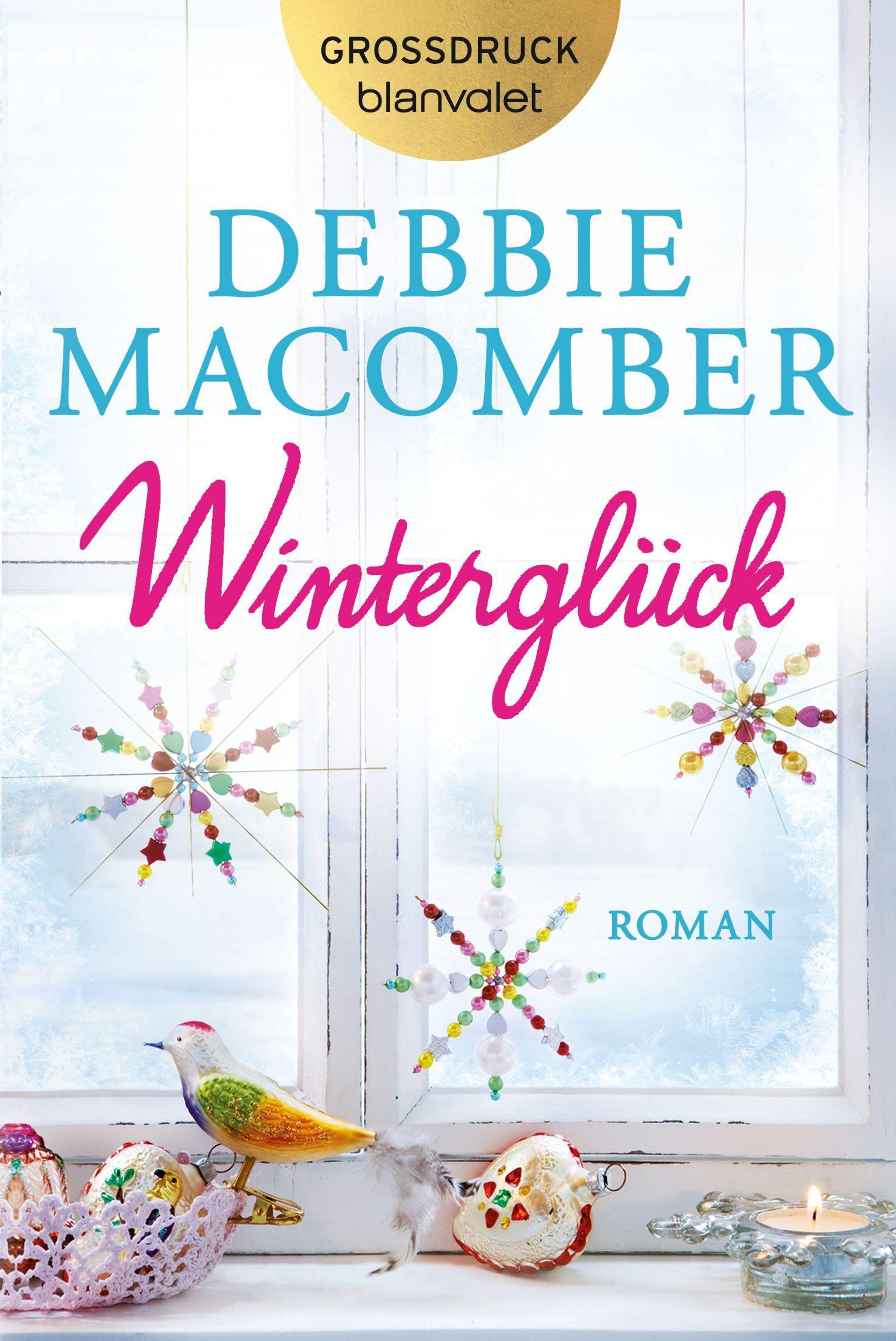 „DEBBIE MACOMBER“, „Winterglück“, „GROSSDRUCK blanvalet“, „ROMAN“. Weihnachtsdeko am Fenster, Vogel und Kerze., Buch