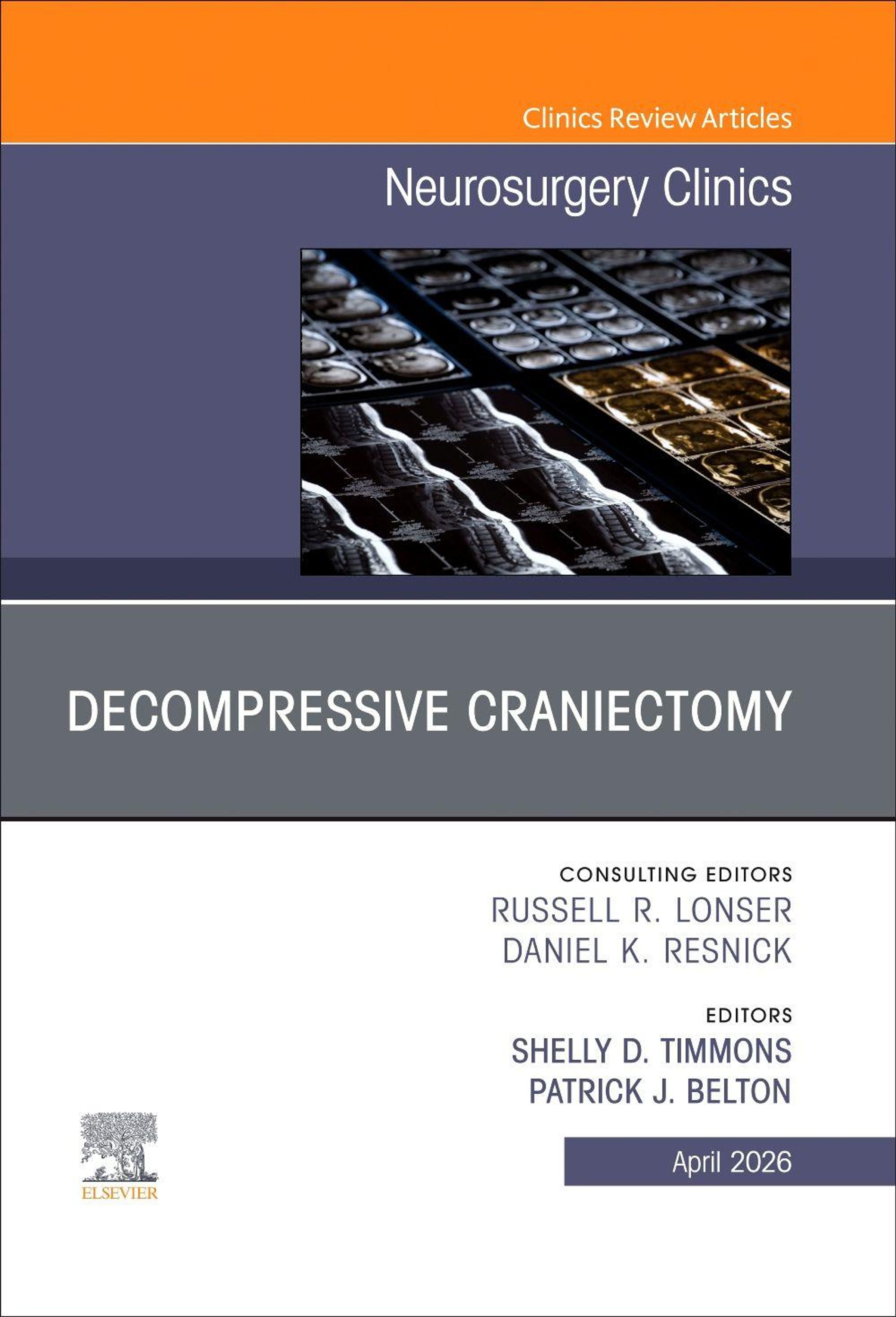 In this issue of Neurosurgery Clinics , guest editors Drs. Shelly D. Timmons and Patrick J. Belton bring their considerable expertise to the topic of Decompressive Craniectomy. Top experts address anatomical and physiological principles; indications and timing in traumatic brain injury; indications and timing in ischemic infarction and other disorders; surgical techniques and complication avoidance; intraoperative management; and more.