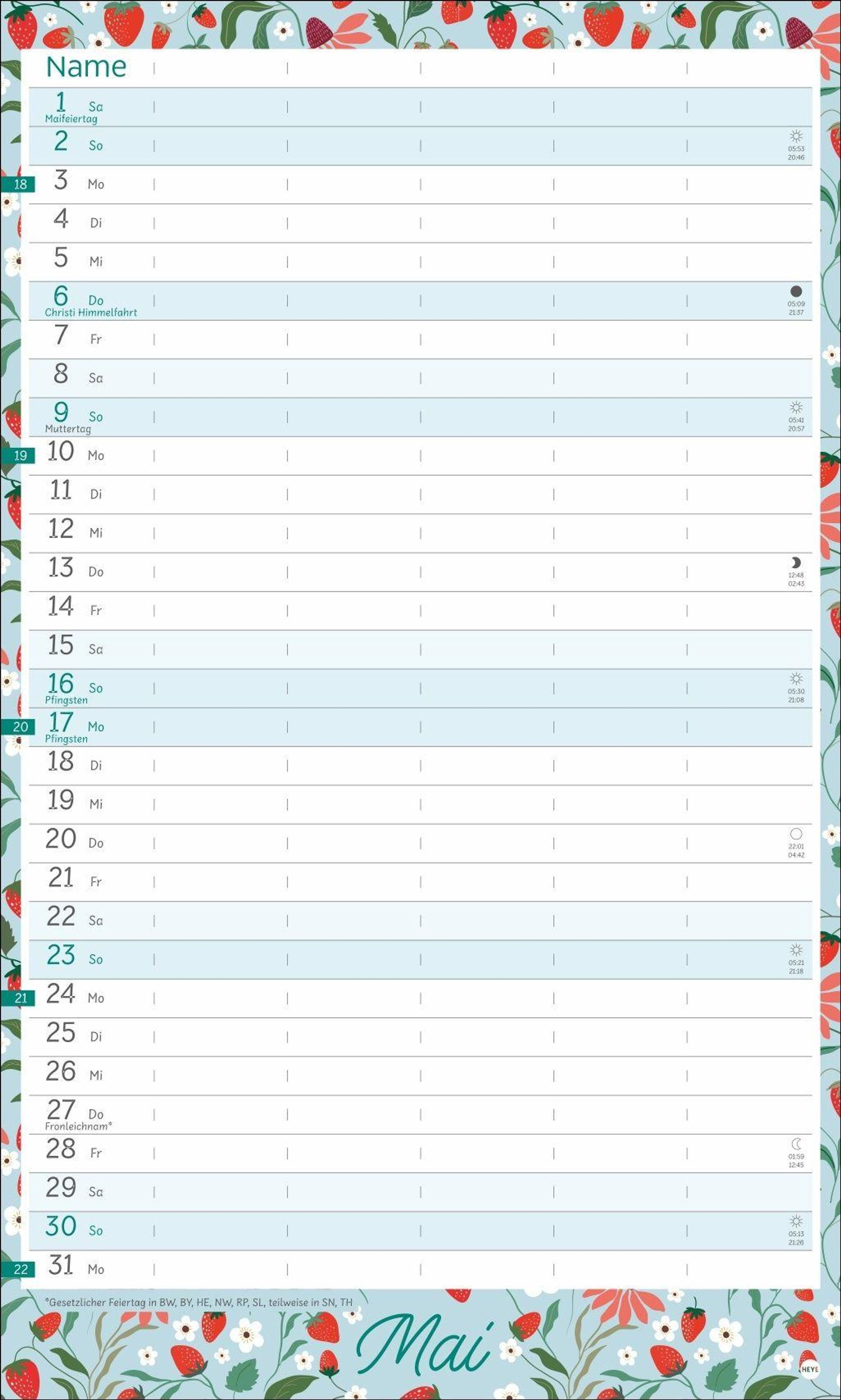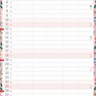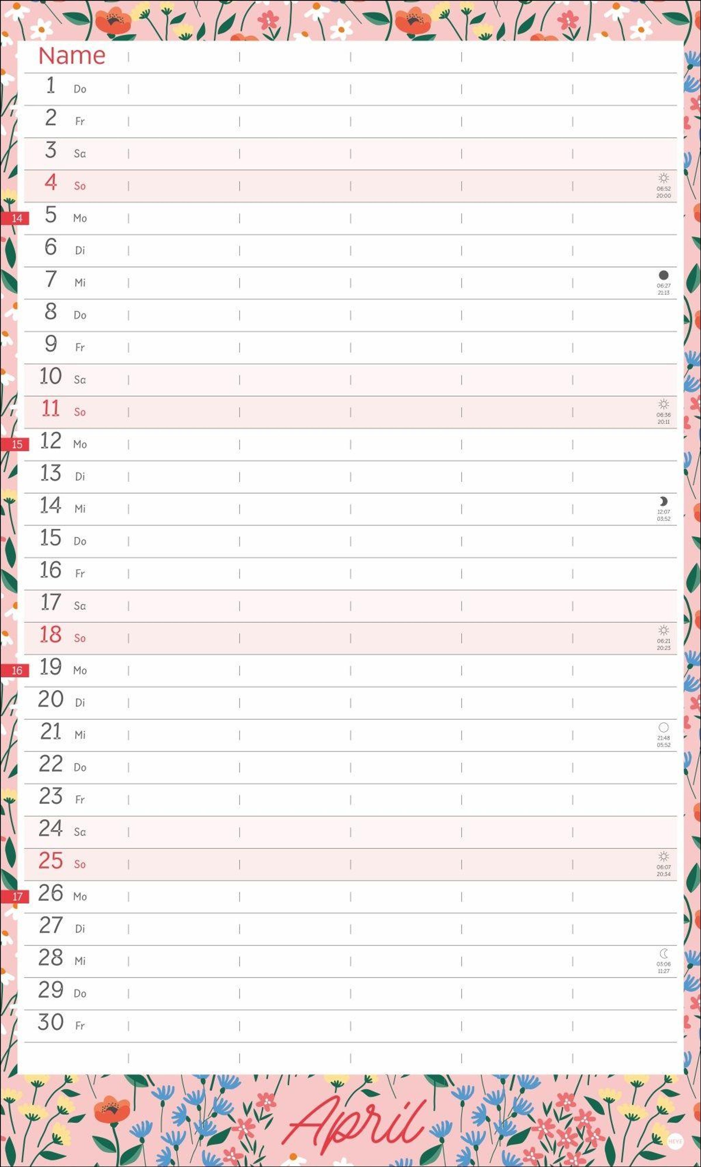 • Familienkalender mit 5 Spalten und Blumen-Motiven. Organisationshilfe mit Stift und Zetteltasche im Format 21 x 45 cm