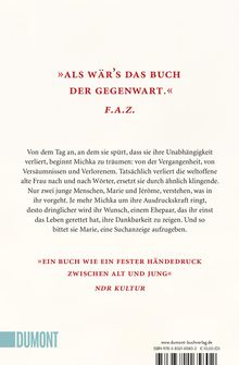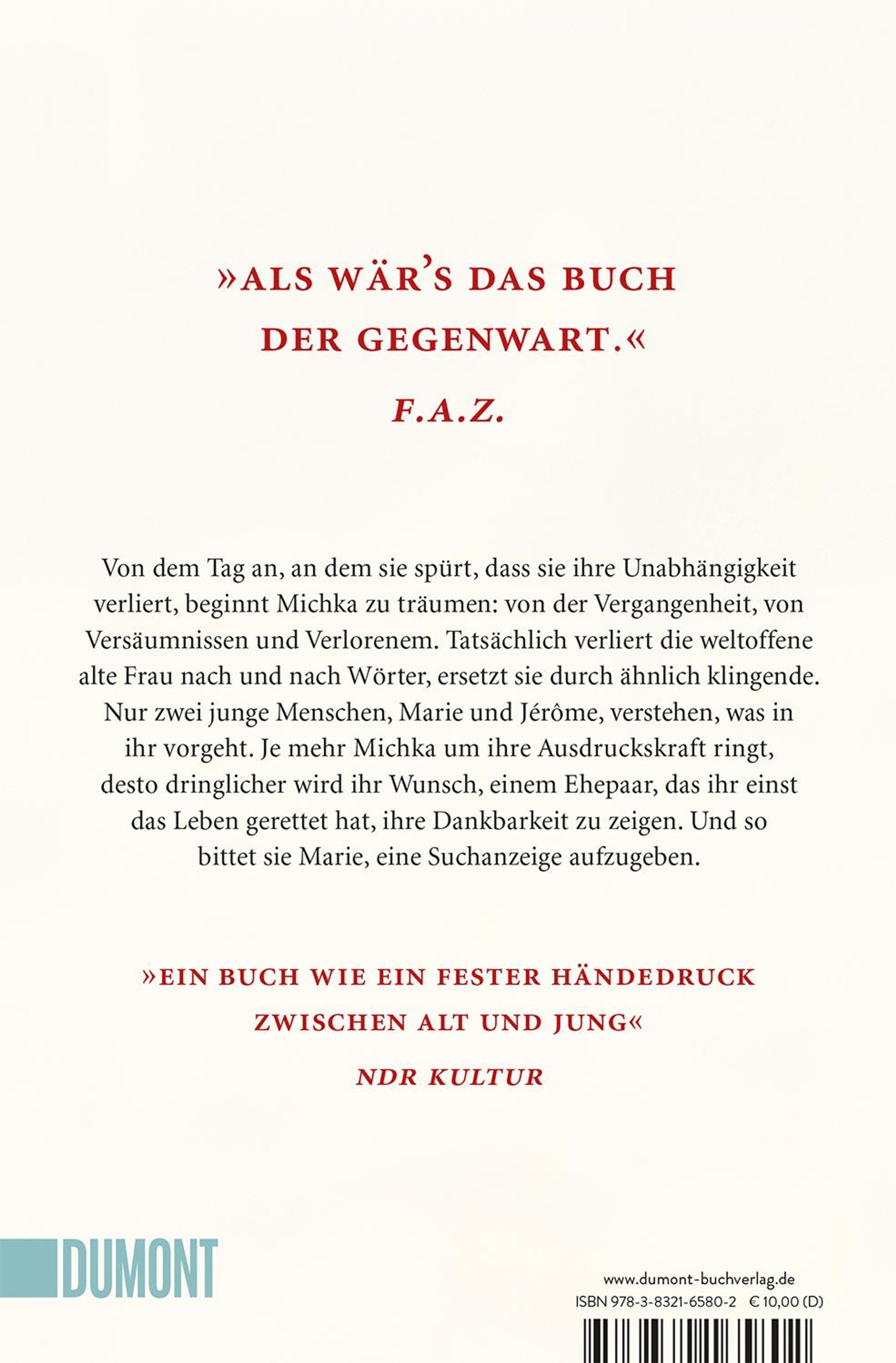 Michka, die stets ein unabhängiges Leben geführt hat, muss feststellen, dass sie nicht mehr allein leben kann. Geplagt von Albträumen glaubt sie ständig, wichtige Dinge zu verlieren. Tatsächlich verliert sie nach und nach Wörter, findet die richtigen nicht mehr und ersetzt sie durch ähnlich klingende. Die junge Marie, um die Michka sich oft gekümmert hat, bringt sie in einem Seniorenheim unter. Der alten Frau fällt es schwer, sich in der neuen Ordnung einzufinden. In hellen Momenten leidet sie unter dem Verlust ihrer Selbständigkeit. Doch was Michka am meisten beschäftigt, ist die bisher vergebliche Suche nach einem Ehepaar, dem sie ihr Leben zu verdanken hat. Daher gibt Marie erneut eine Suchanzeige auf, und Michka hofft, ihre tiefe Dankbarkeit endlich übermitteln zu können. Klarsichtig und scharfsinnig zeigt Delphine de Vigan, was uns am Ende bleibt: Zuneigung, Mitgefühl und Dankbarkeit.