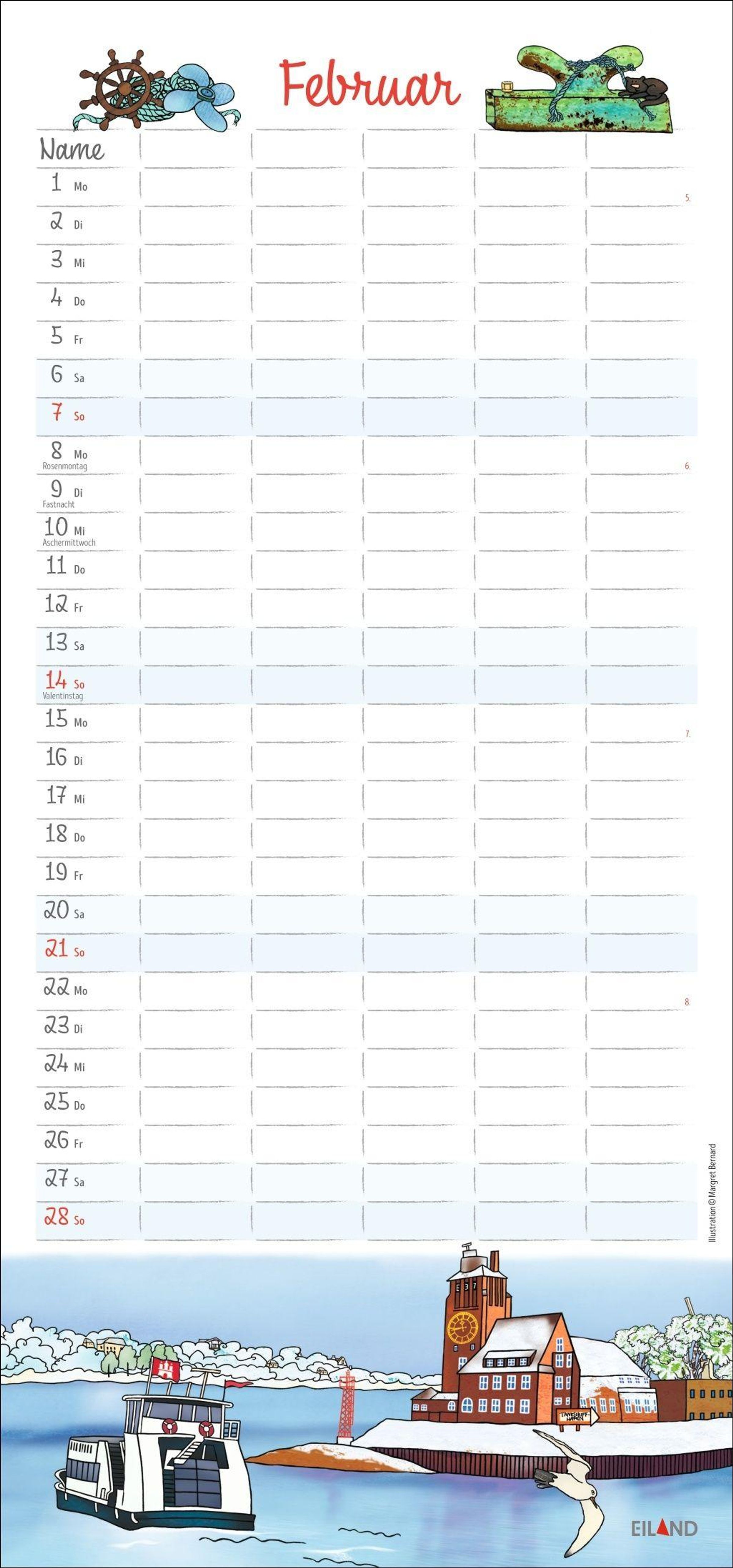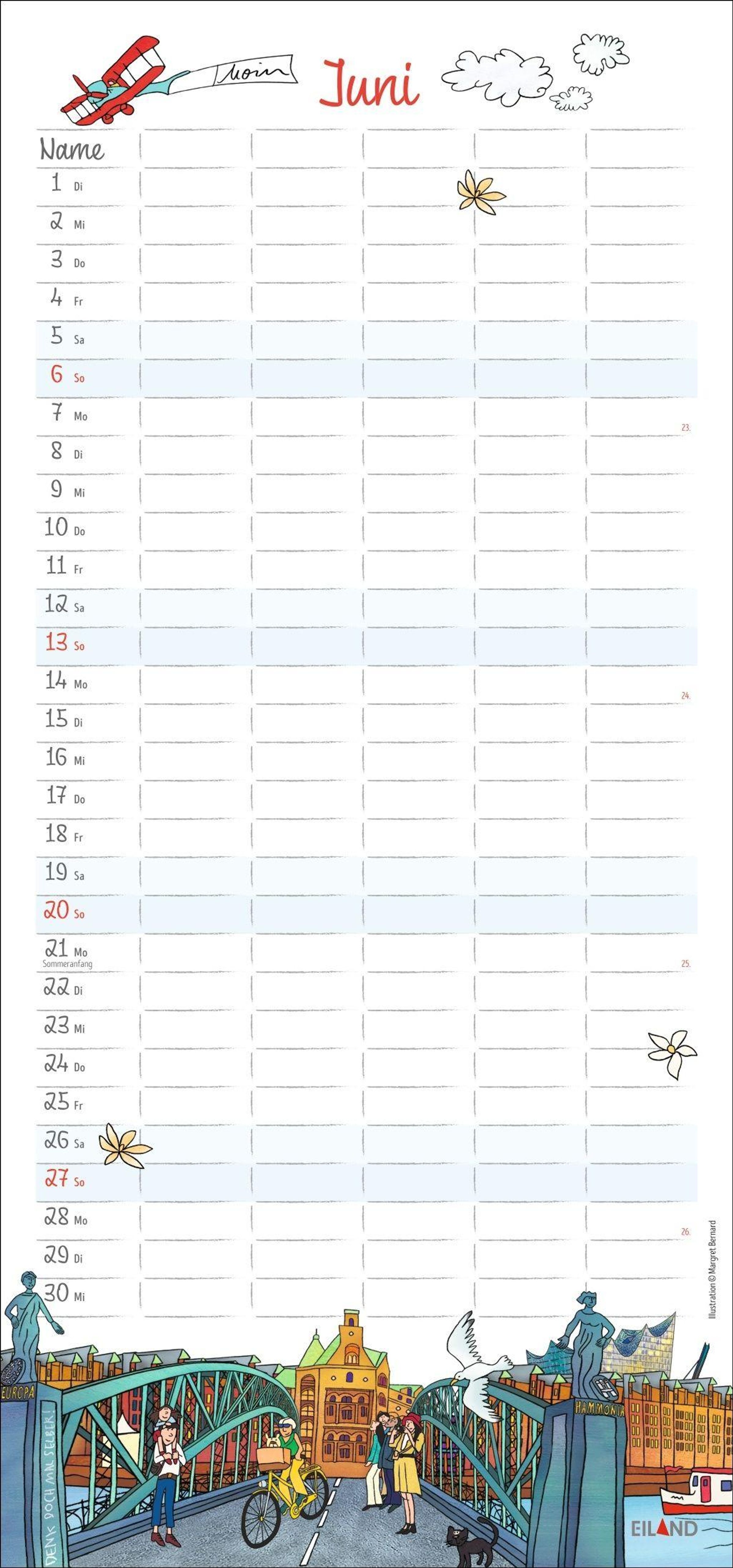 Platz für Termine, Ferien- und Freizeitaktivitäten und dazwischen farbenfrohe Zeichnungen über das Leben zwischen Alster, Elbe und Hafen