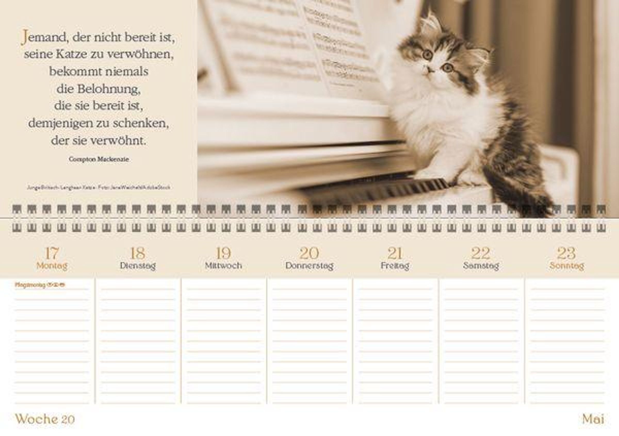 Dieser Tischkalender ist der perfekte Jahresbegleiter für alle Katzenfans. Stimmungsvolle Fotos im edlen Duplexton und inspirierende Sprüche ergeben für jede Woche eine traumhafte Kombination. Mit edler Goldfolie auf dem Titel.