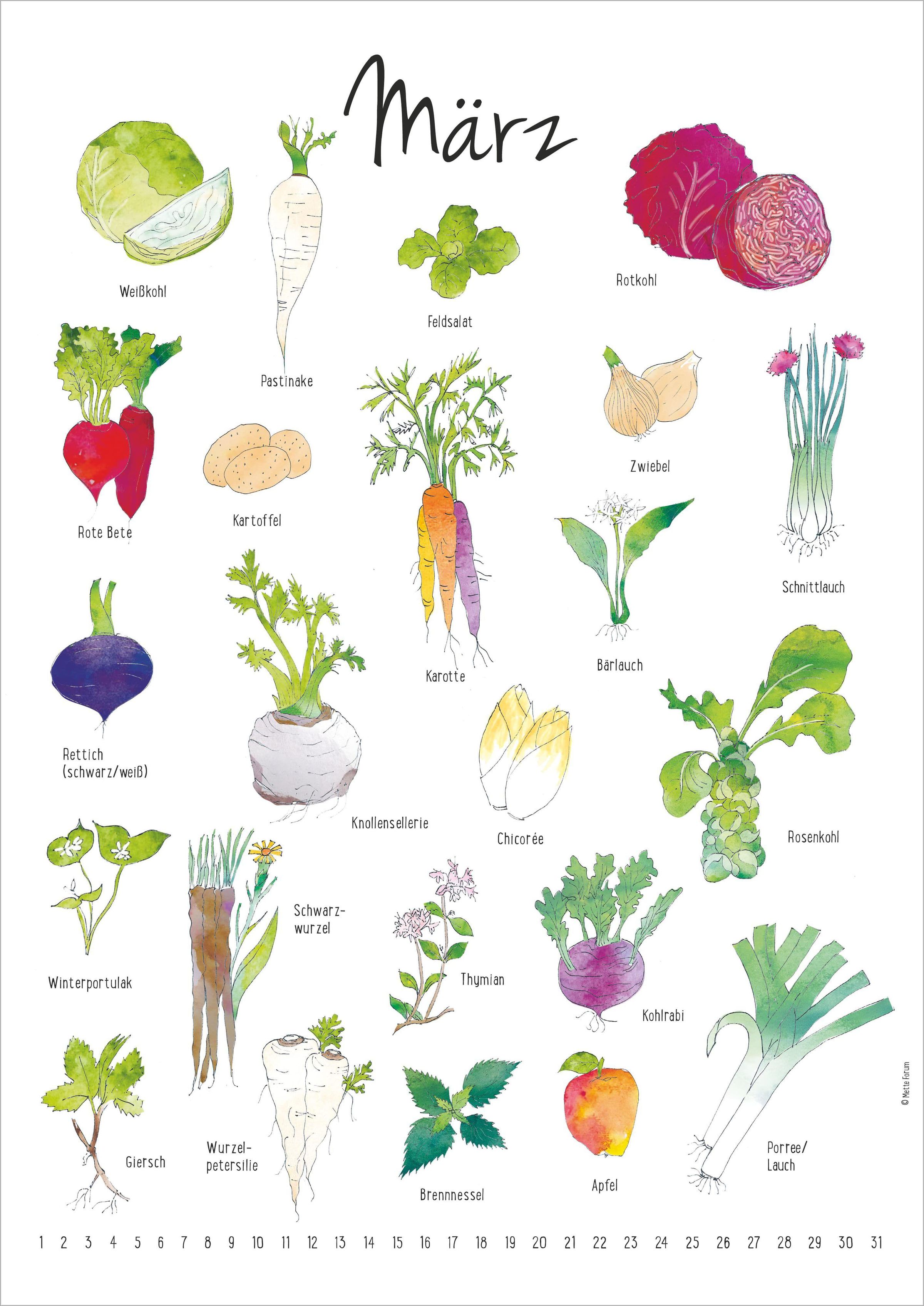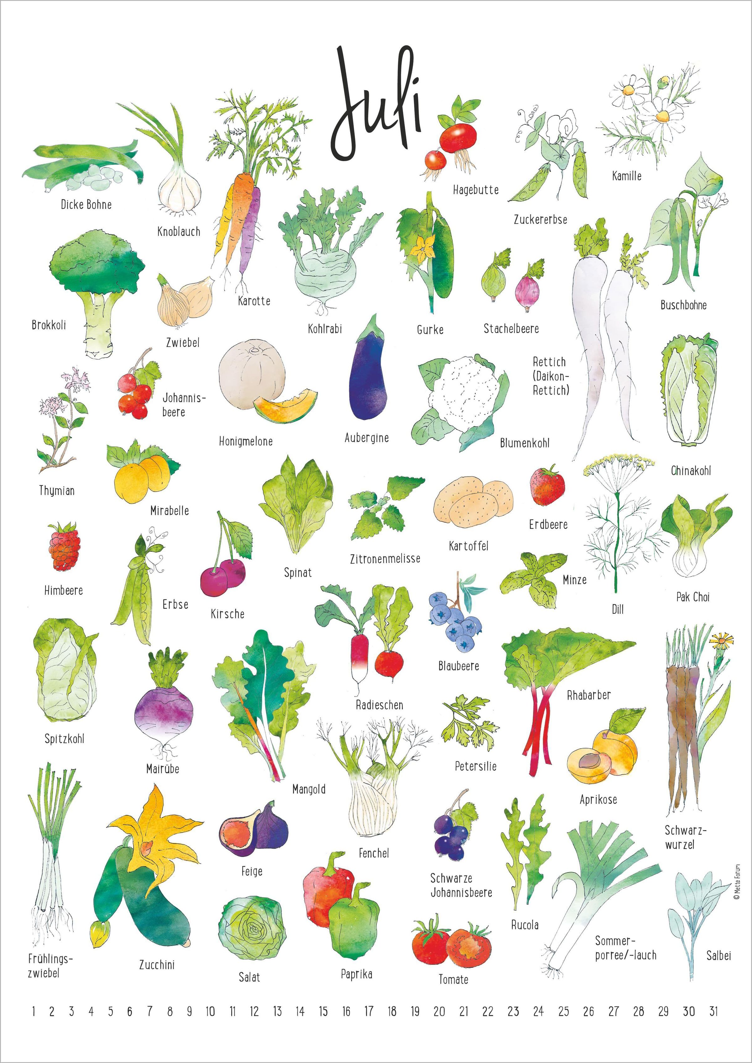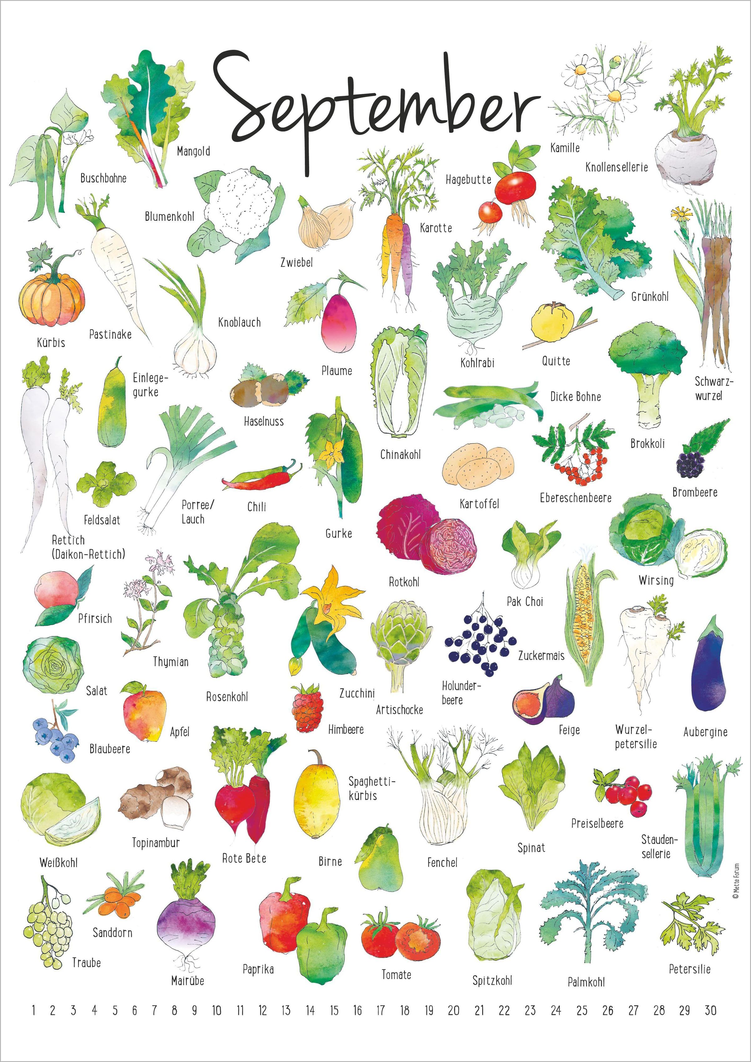 - Eine Übersicht über Gemüse, Früchte und Kräuter zu ihrer Erntezeit