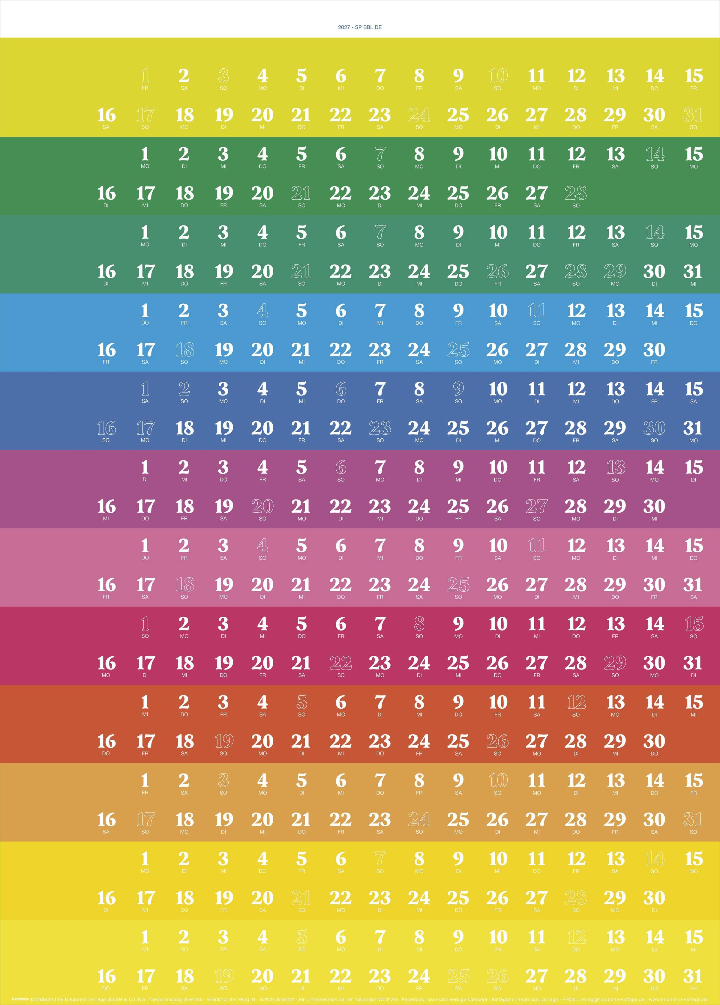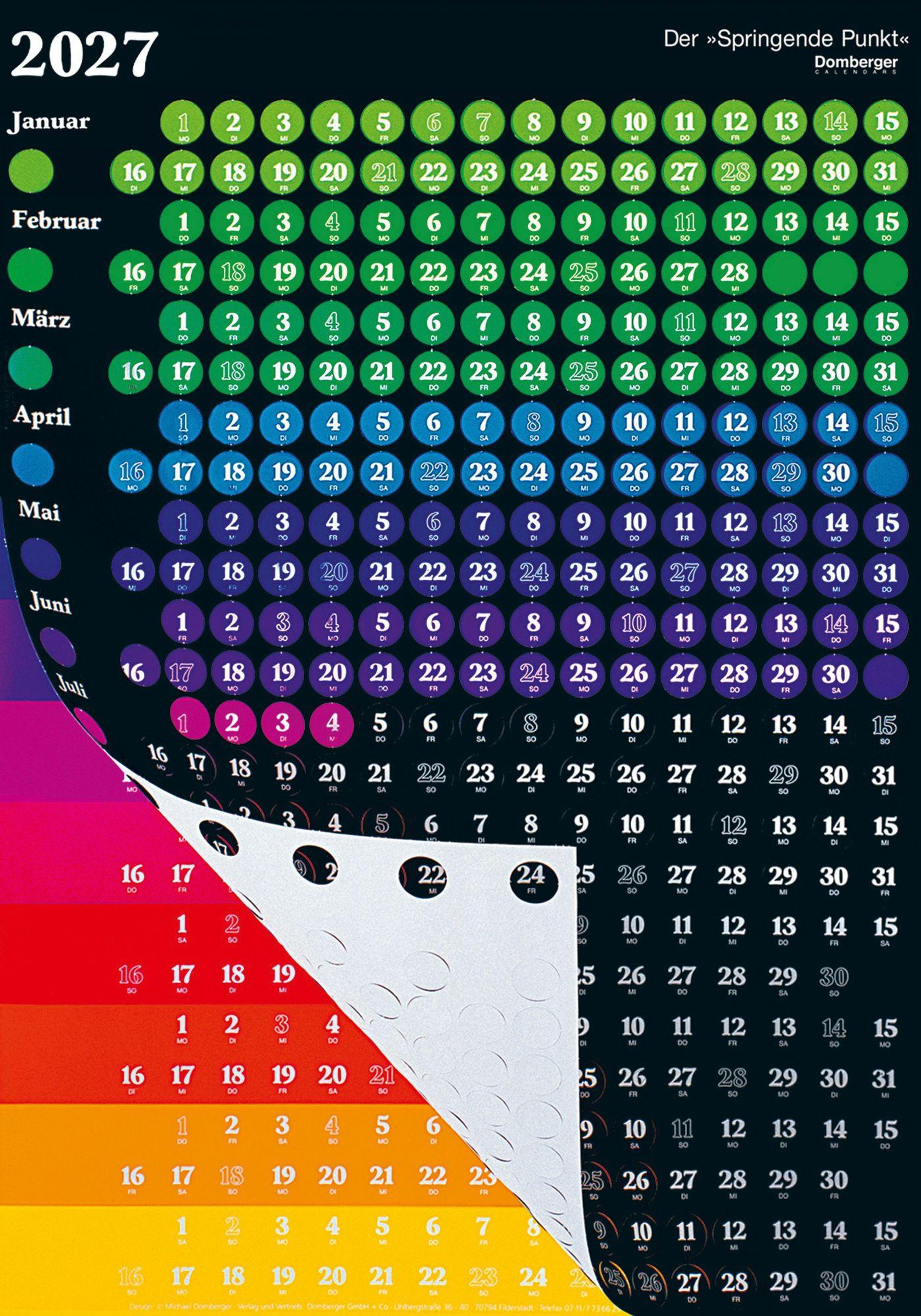 2027, "Der »Springende Punkt«", Januar bis Juli. Kalender mit farbigen und nummerierten Kreisen für jeden Monatstag., Kalender