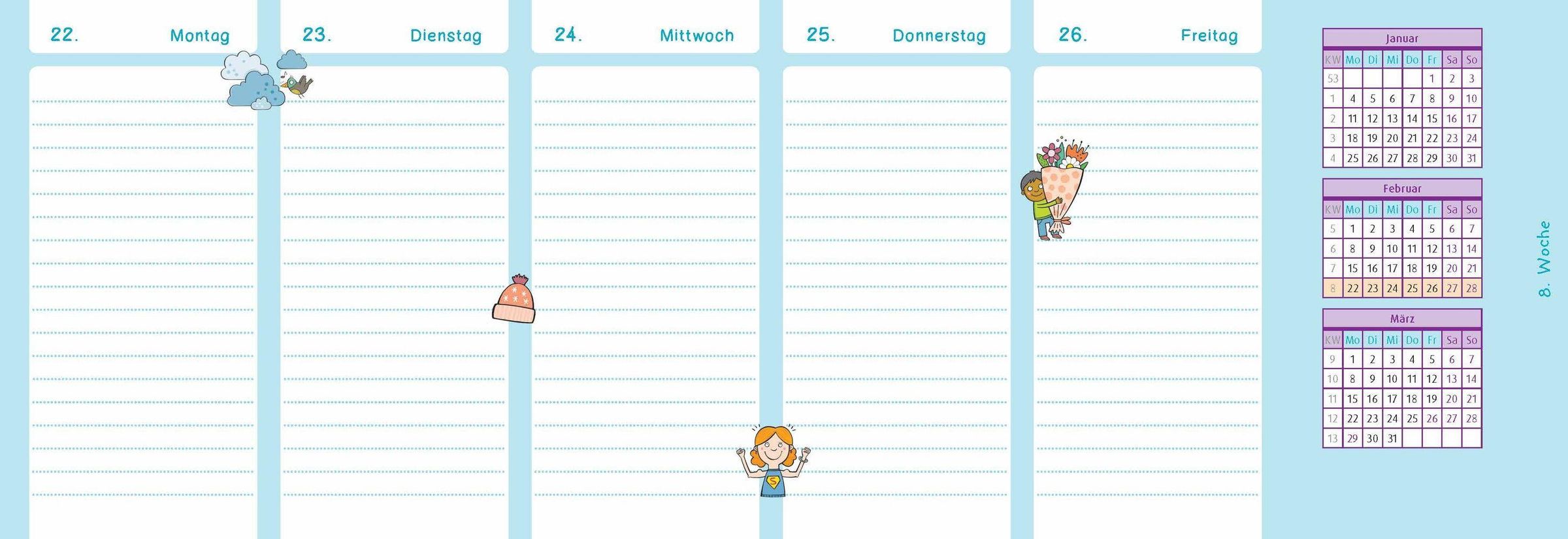 In der übersichtlichen Wocheneinteilung ist jeweils genug Platz für eigene Termine und Notizen; die Wochentage selbst sind unterteilt von der 1. bis zur 6. Stunde.