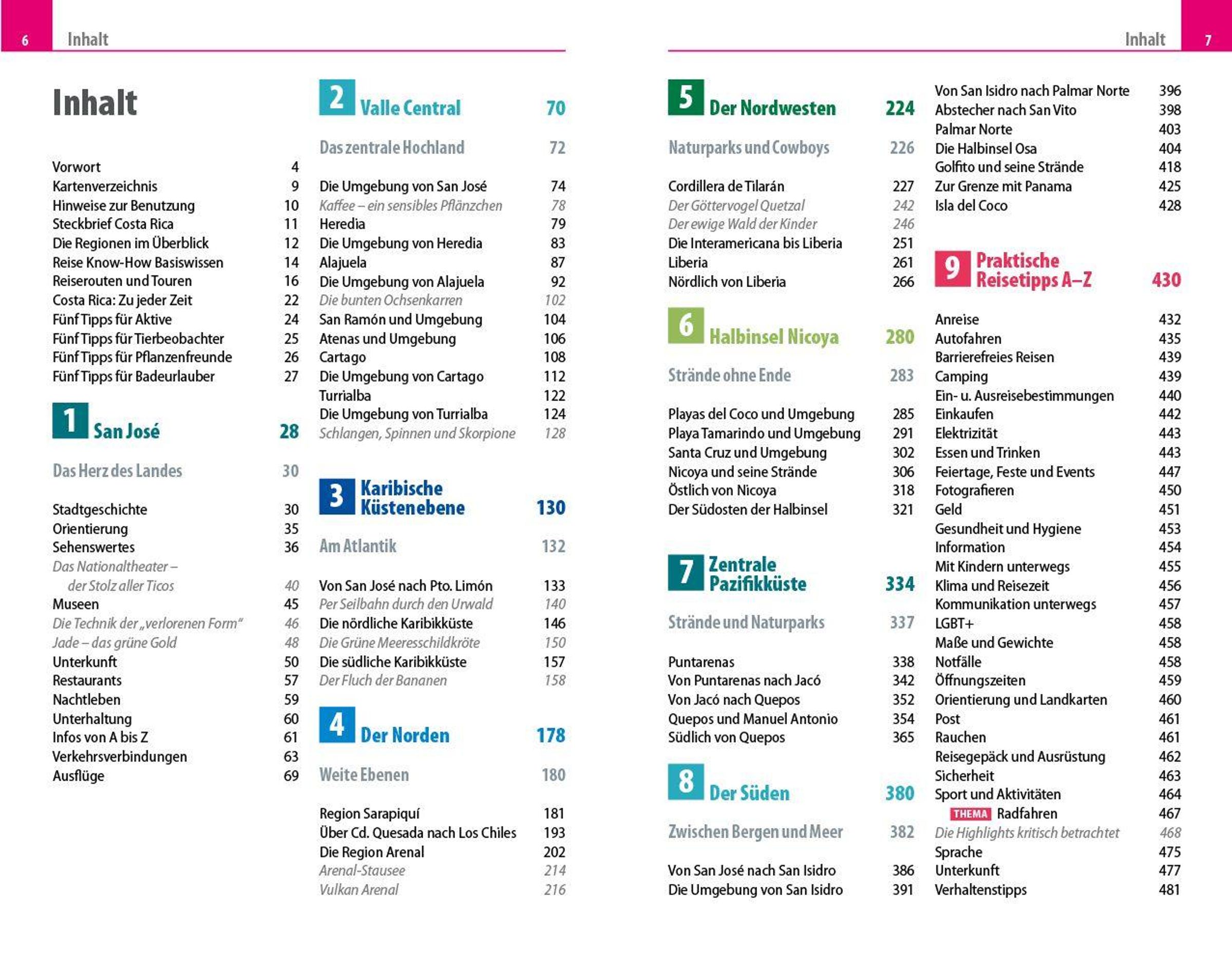 Übersichtsseiten mit den bedeutendsten Regionen im Überblick: San José, Valle Central, Karibik, der Norden, der Nordwesten, die Halbinsel Nicoya, die zentrale Pazifikküste und der Süden