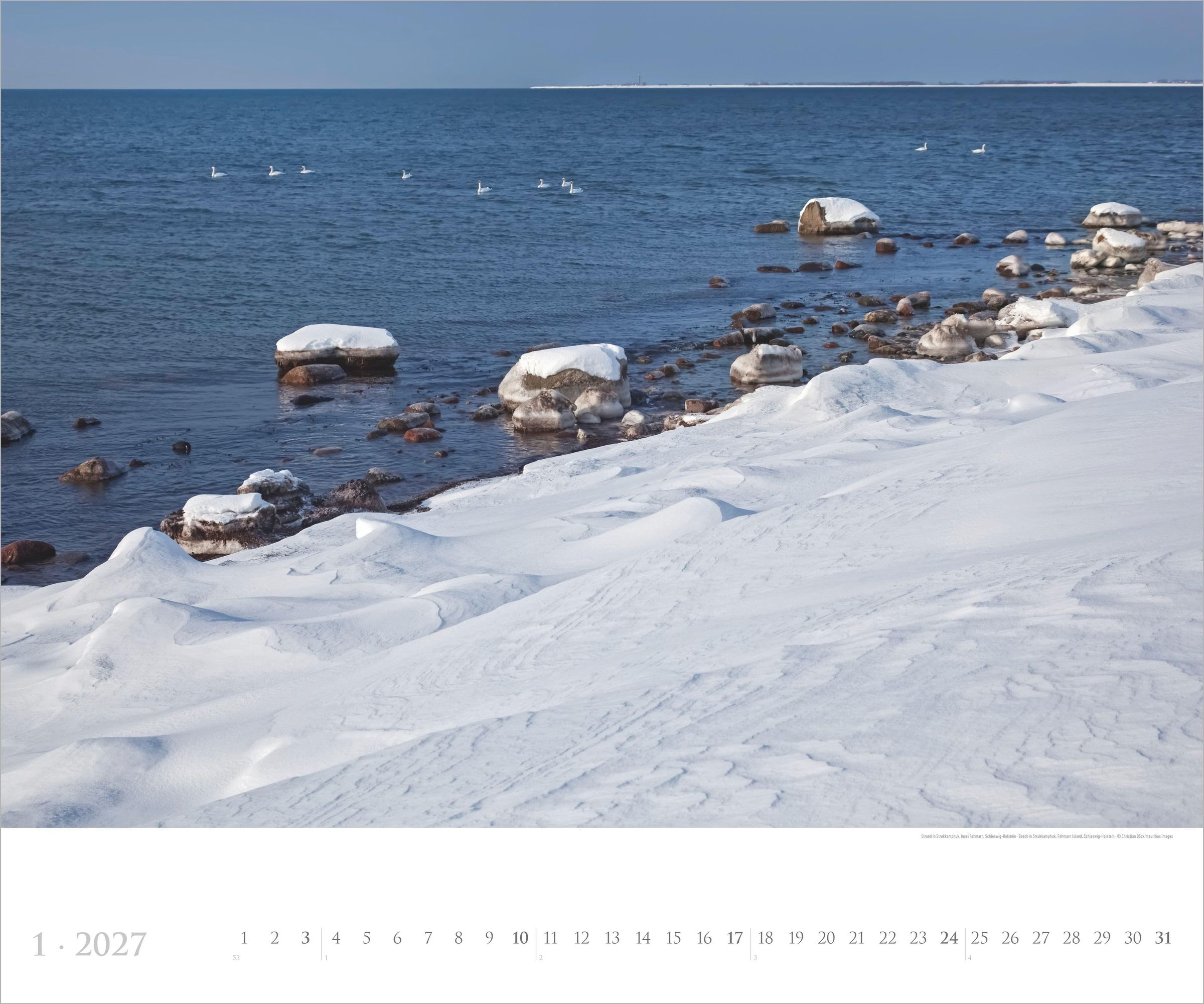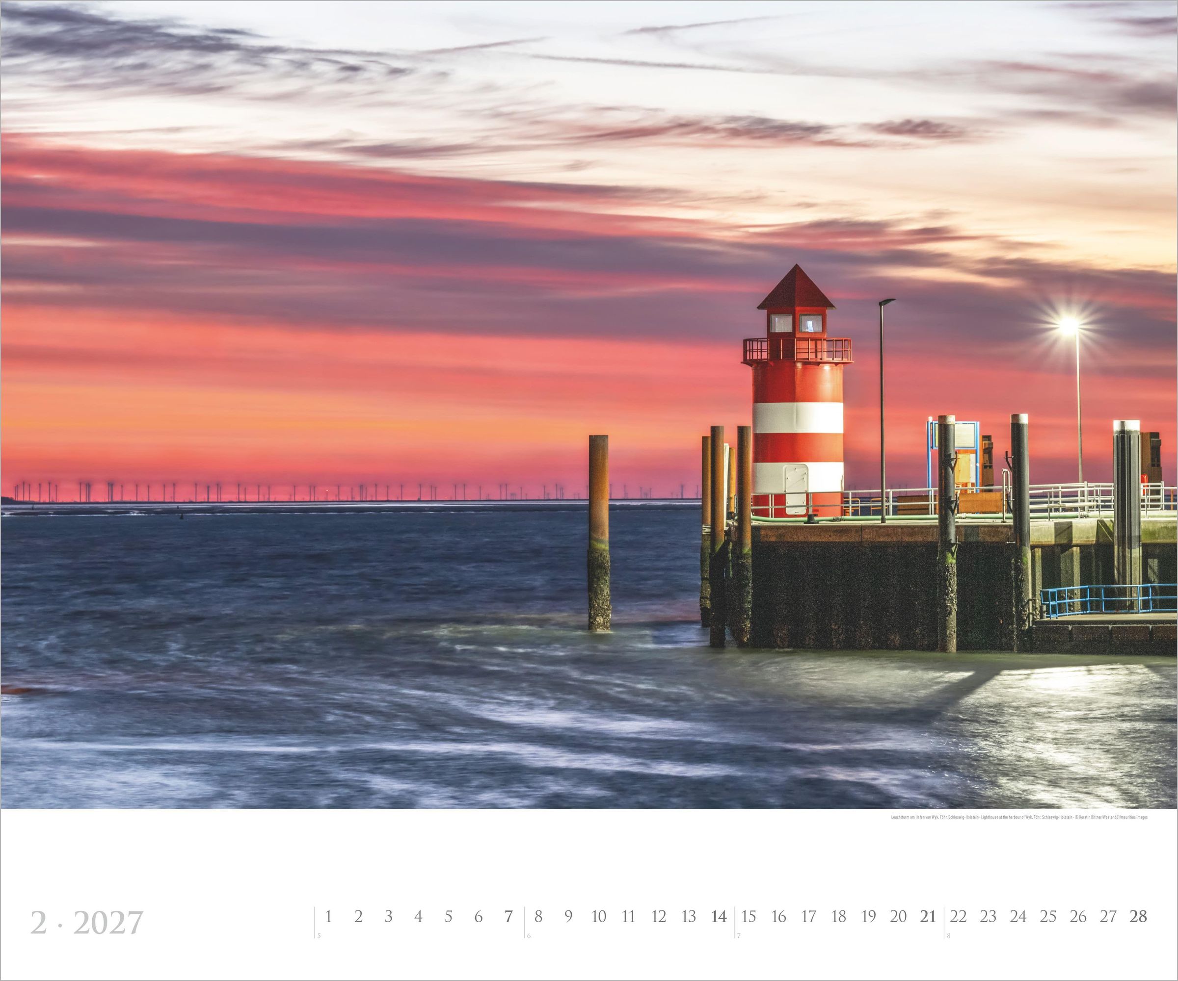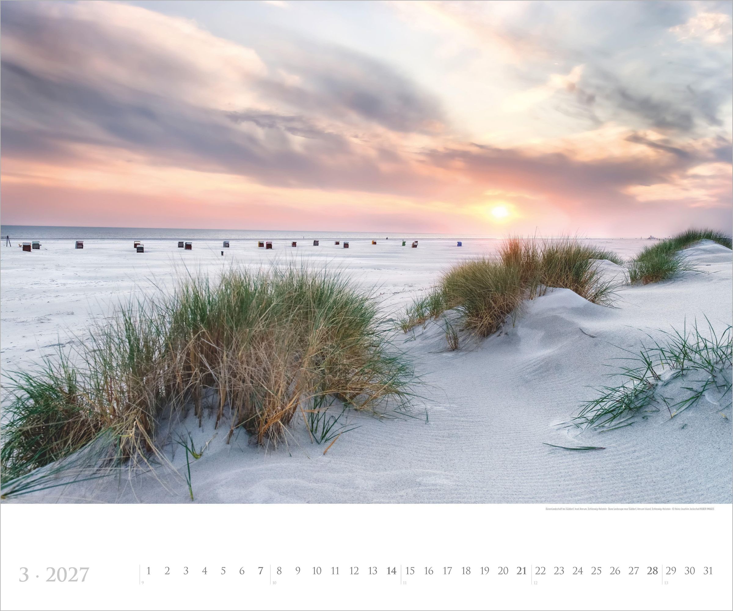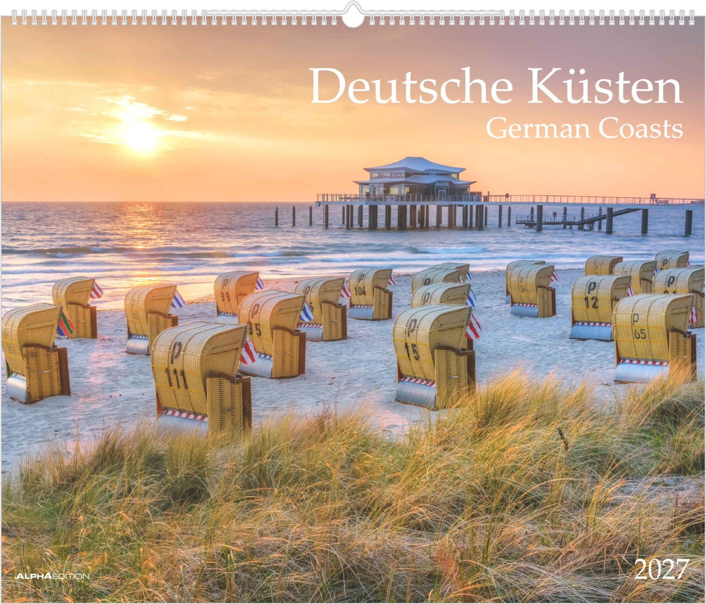 "Deutsche Küsten", "German Coasts", "2027". Strandkörbe bei Sonnenuntergang am Meer, im Hintergrund ein Gebäude auf Stelzen., Kalender