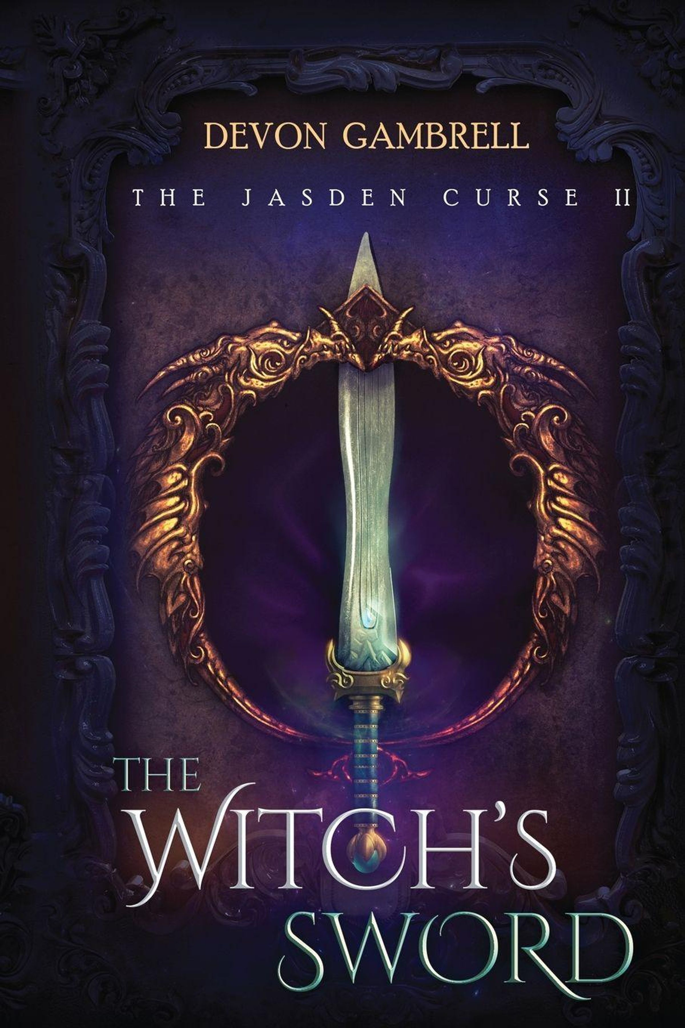 Titel: "The Witch's Sword". Autor: Devon Gambrell. Ein schwebendes, kunstvoll gestaltetes Schwert vor einem dunklen, mystischen Hintergrund., Buch