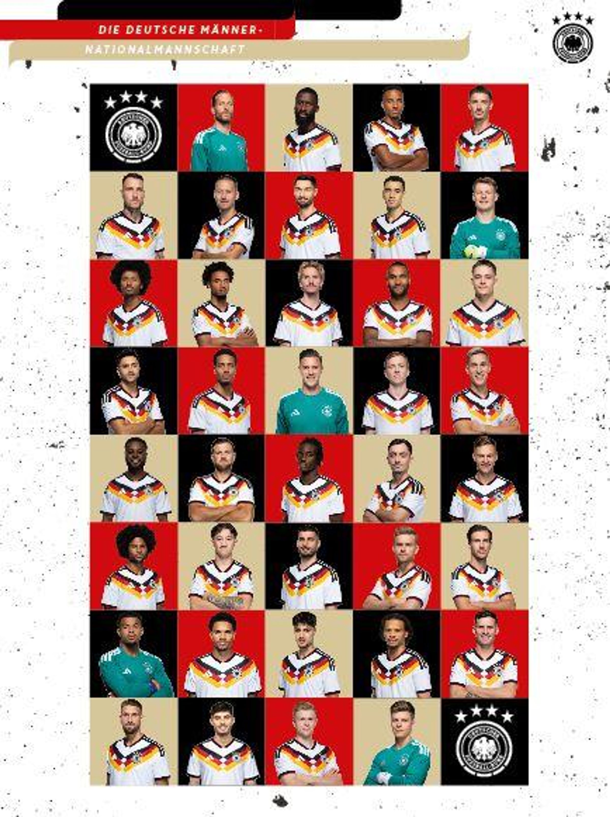 "FUSSBALLSTARKER RÄTSELSPASS", "MIT STICKERN!", sieben Fußballspieler in weißen Trikots mit Deutschland-Design., Buch