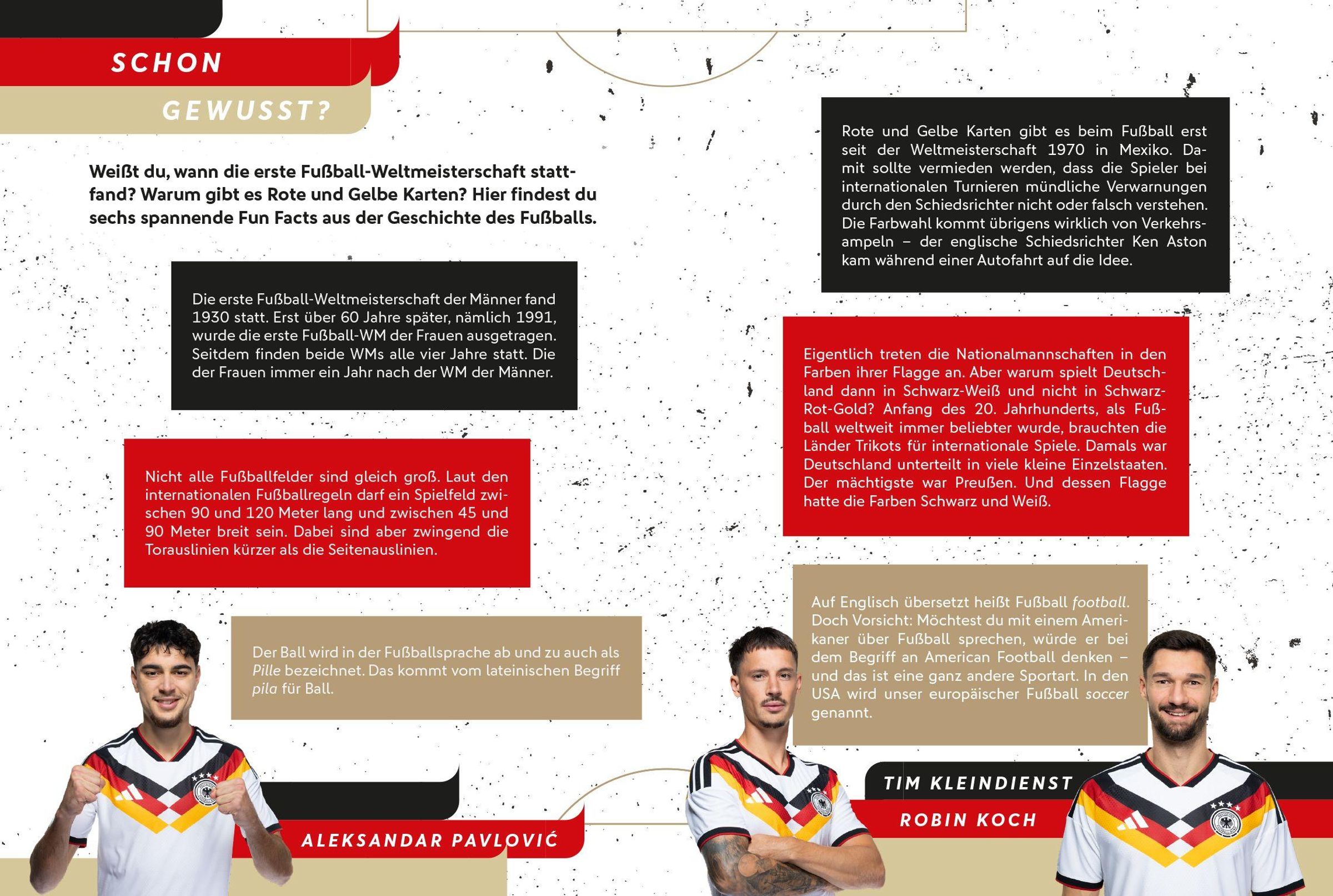 Dieses Freundealbum ist genau das Richtige für echte Fußballfans! Denn hier sind alle Topspieler der deutschen Nationalmannschaft versammelt, und deine Freunde haben genug Platz, sich einzutragen und dir einiges über sich zu verraten. Außerdem findest du noch jede Menge nützliche Tipps, Tricks, coole Witze und knifflige Quizfragen rund ums Thema Fußball.