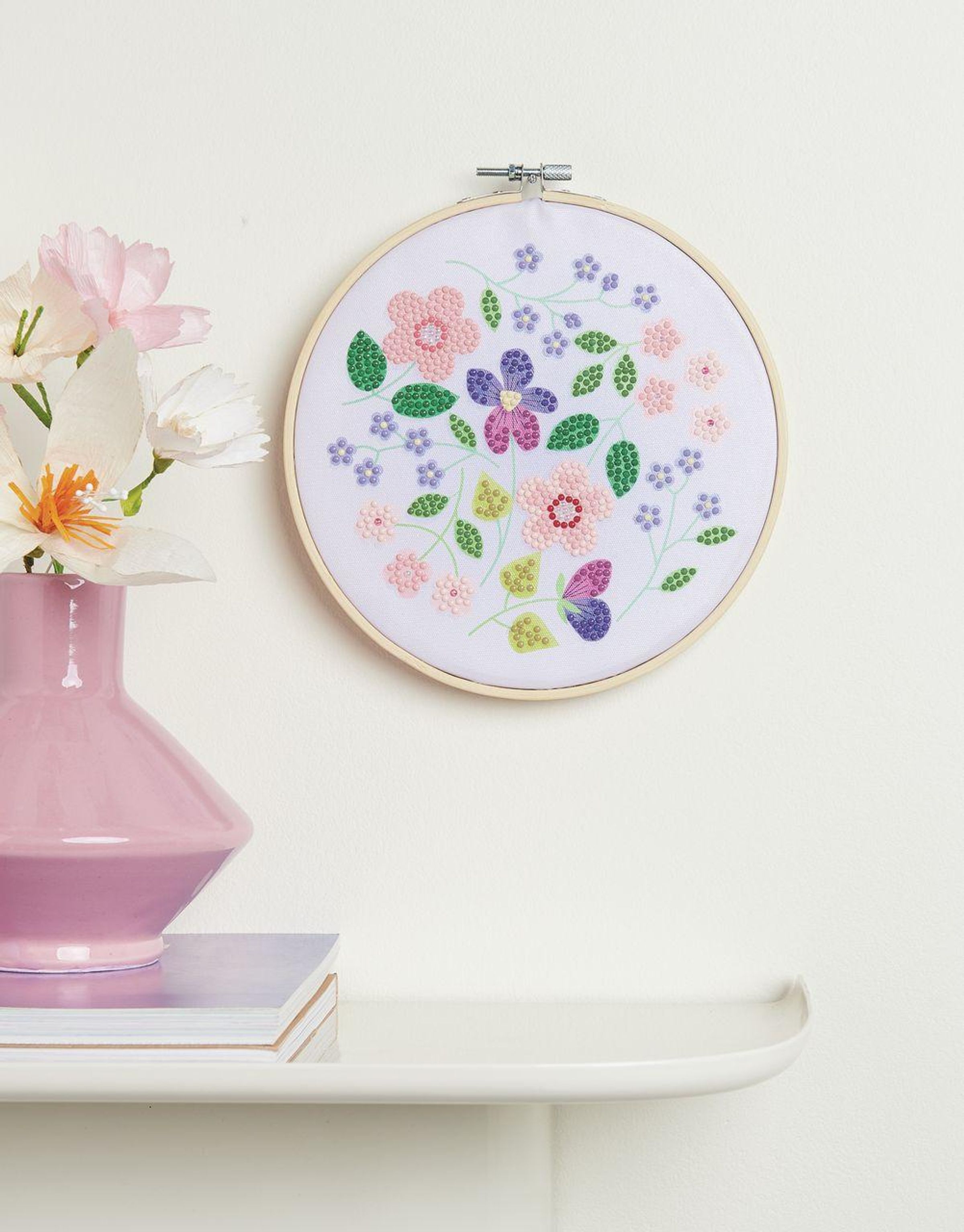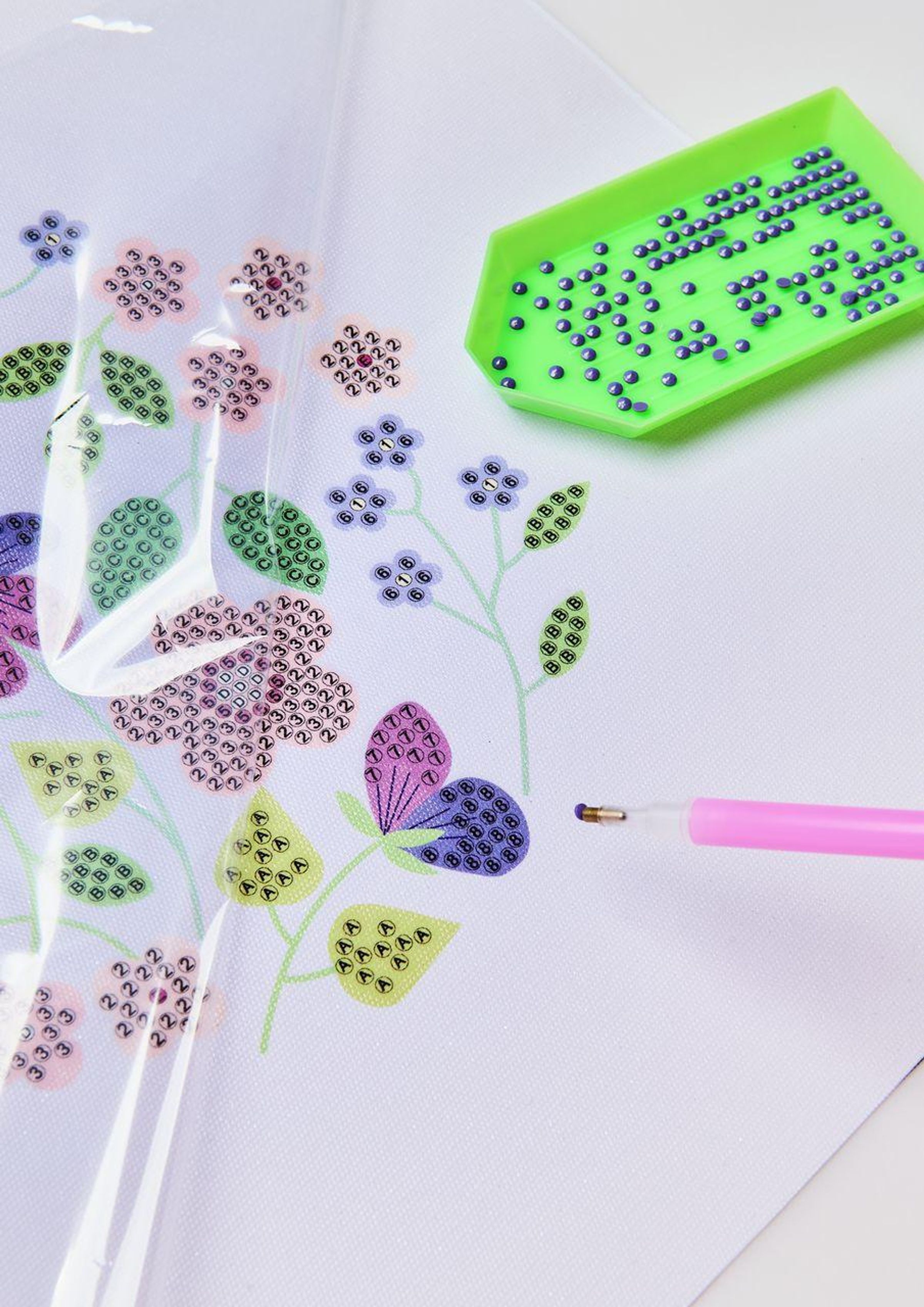 Das Diamond Painting Kids Set Bamboo Ring Flowers 1 kombiniert eine bedruckte Leinwand mit einem stabilen Bambusring. Das Motiv mit Klebefläche wird in den Ring eingespannt und anschließend mit den beiliegenden Diamanten gestaltet. Zum Set gehören außerdem ein Applikationsstift, ein Sortierschälchen, zwei Silikonpads sowie eine Anleitung. So entsteht ein dekoratives Bild, das sich direkt im Stickring präsentieren lässt.